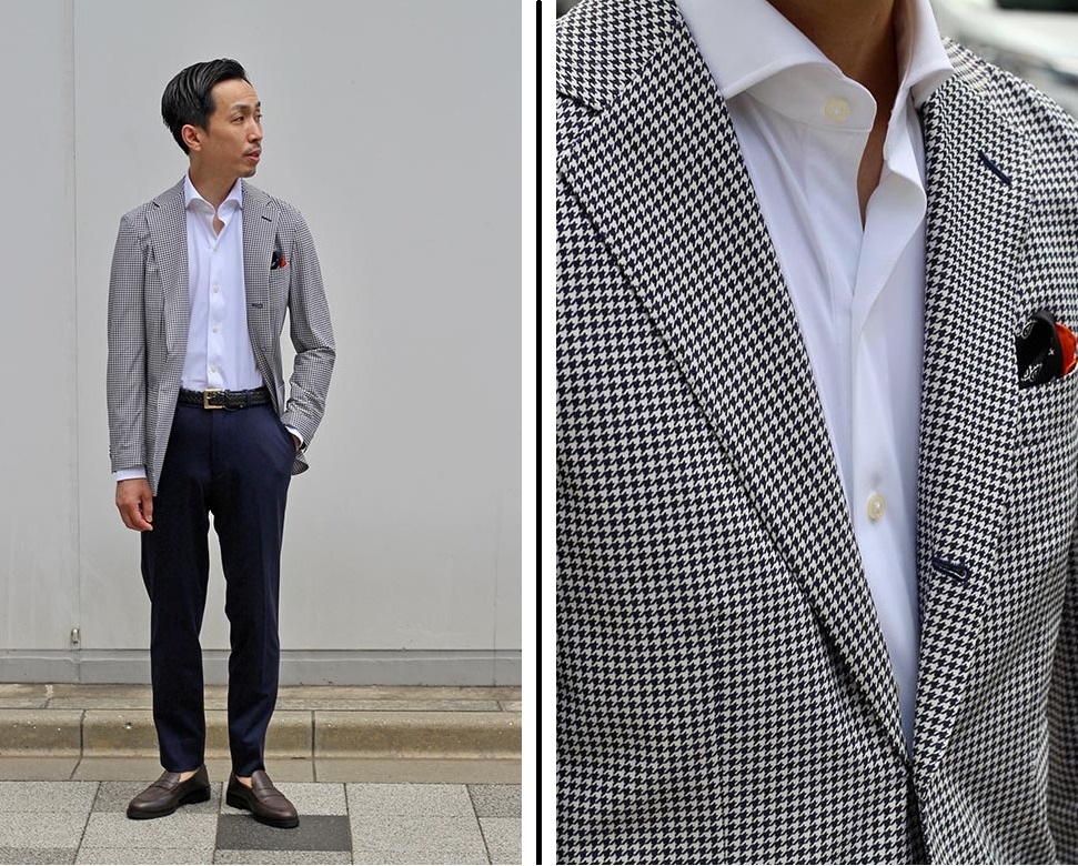 ネイビージャケットコーデにマンネリを感じている方におすすめしたい 装いのご提案です。軽量且つ伸縮性に富んだブルーの千鳥柄のジャケットにシンプルに 白シャツを合わせて上品な印象に。ボトムは、コットンライクな ジャージー素材のネイビーパンツをセレクト。落ち着いた印象に纏めつつ、 着用感は軽やかに仕上げております。