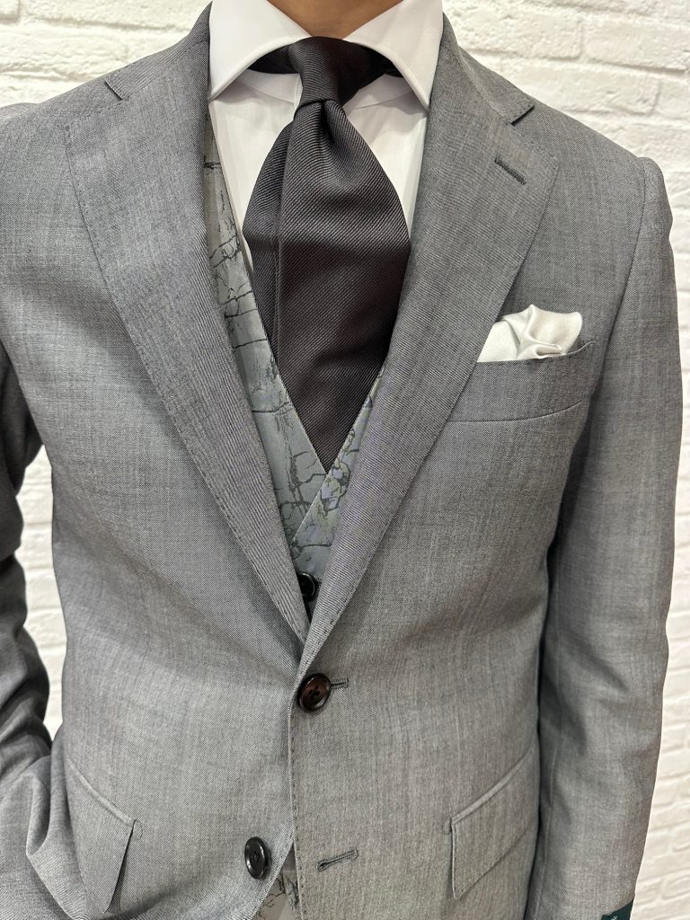 そして一番の特徴はにベストがリバーシブルでご使用いただける点です。写真のような柄物と、スーツと同生地の無地で使い分ける事が出来ますので多くのシーンでアレンジいただけます。