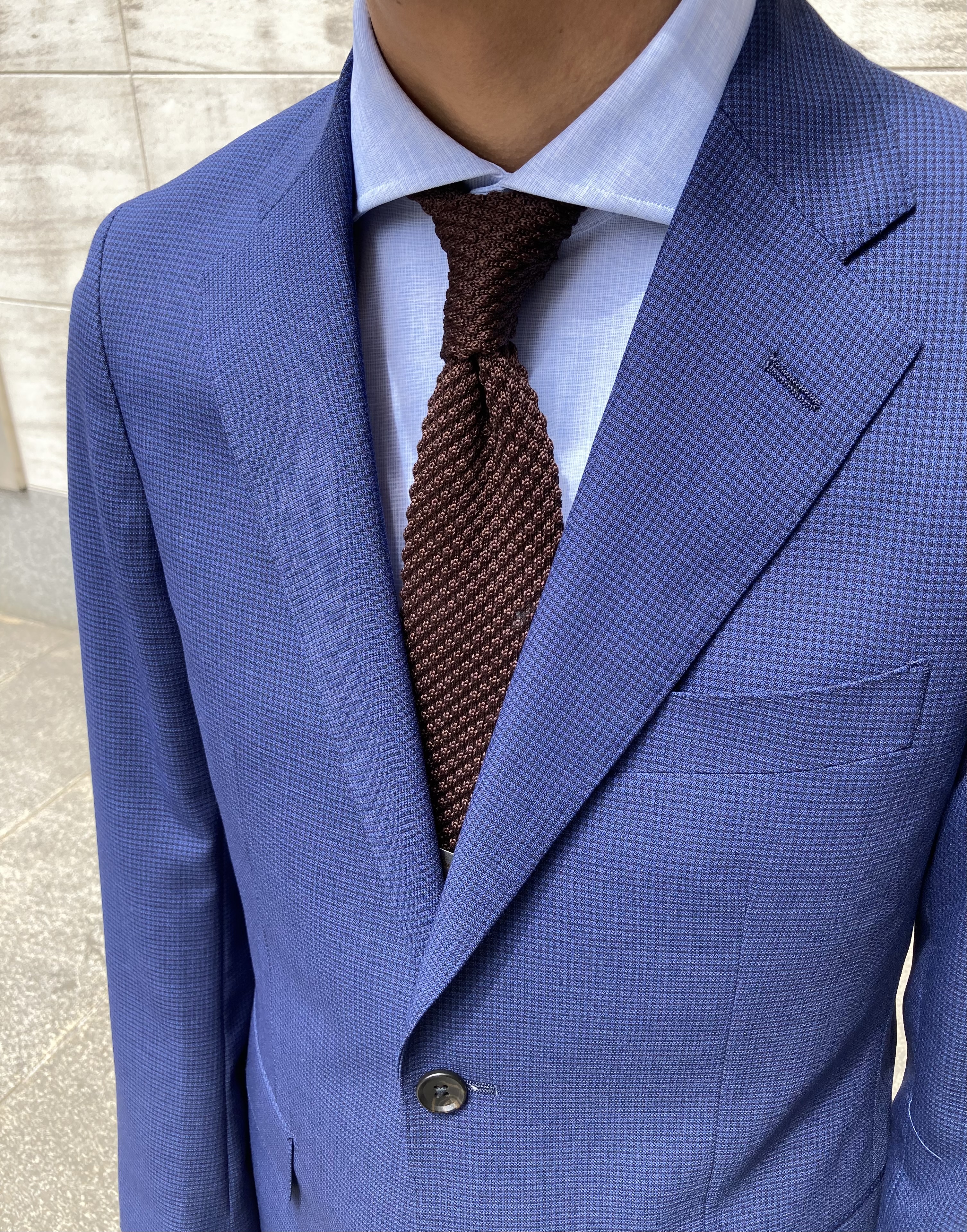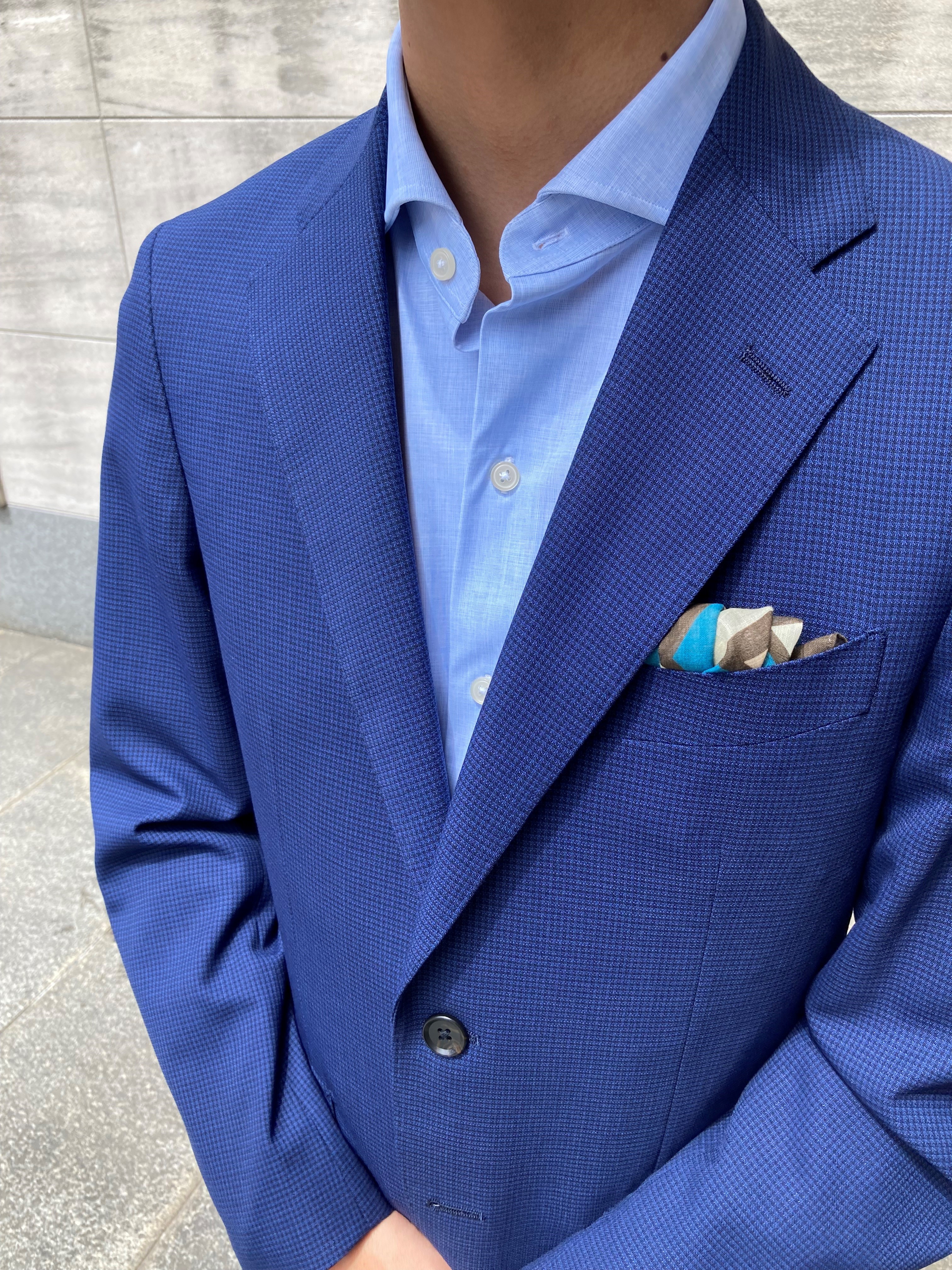 爽やかなブルーのマイクロハウンドトゥース柄で作っており