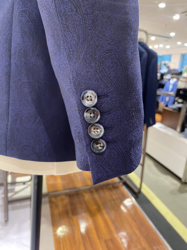 スーツのモデルはモンテカルロモデル。ボタンは本水牛、裏地はイタリー製を使用しております。