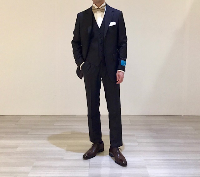 コーディネートはスーツの絶妙な光沢感が映えるようシンプルに♪