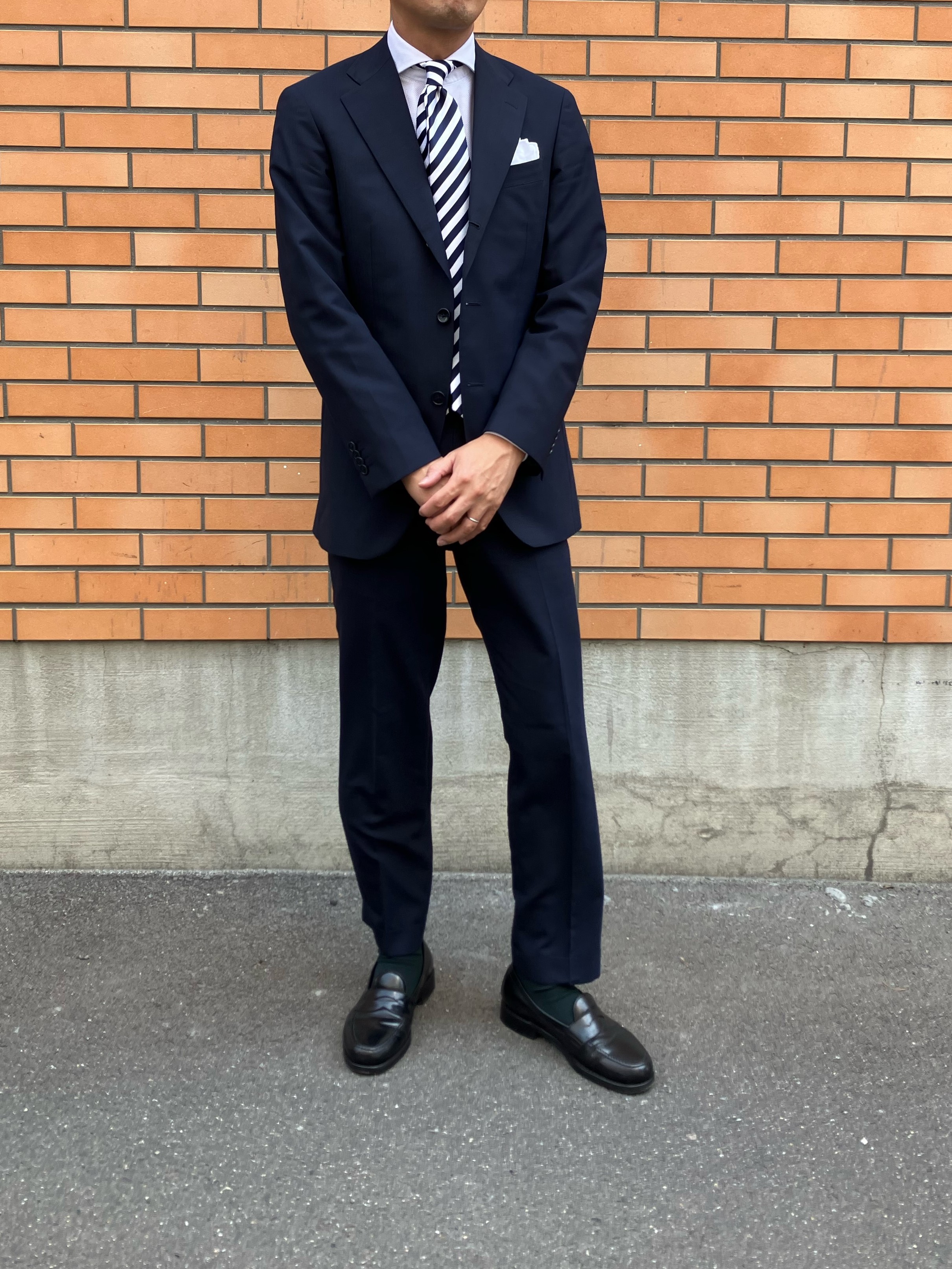 演出してくれるネイビーのスーツスタイルです。