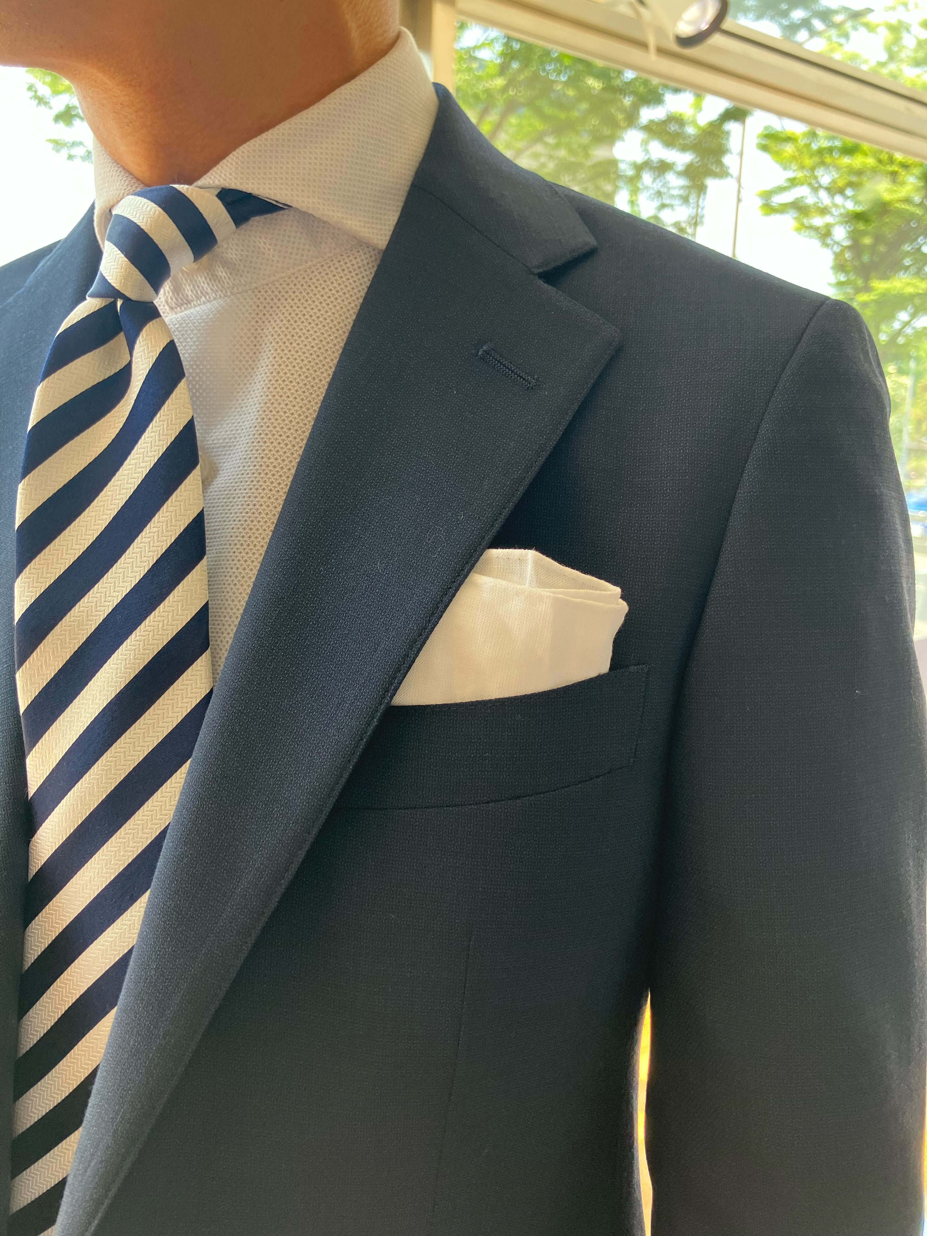 王道の白の無地シャツにネイビーのストライプタイを