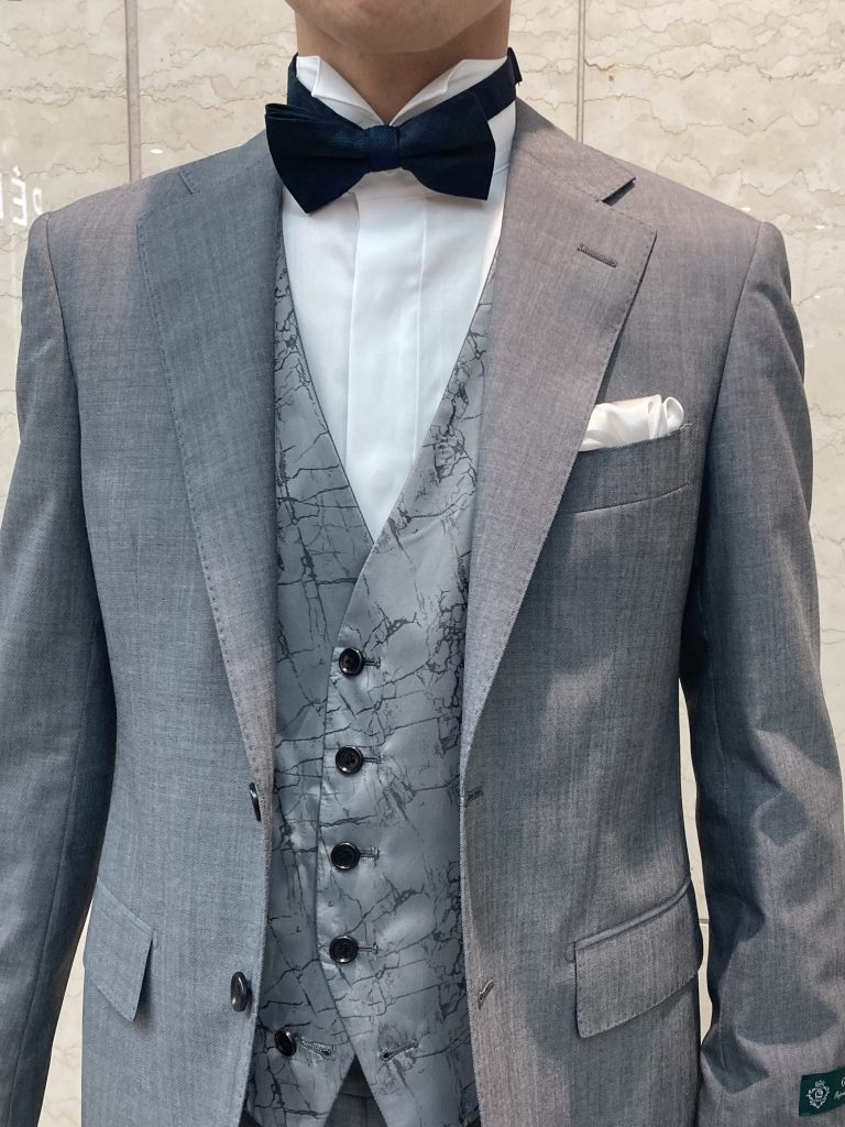 光沢のあるジャガードの織り柄素材ベストが付属のスーツです。