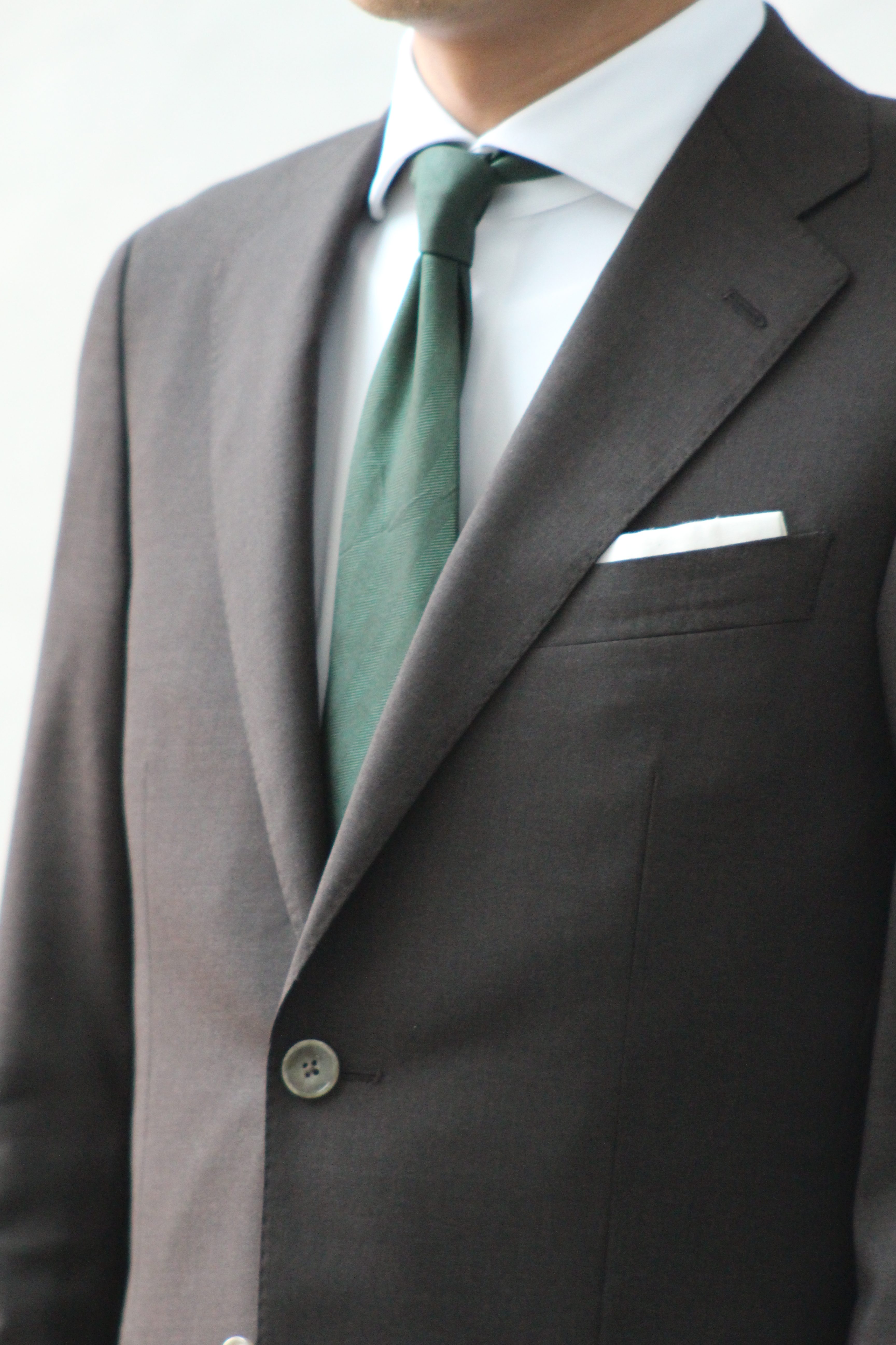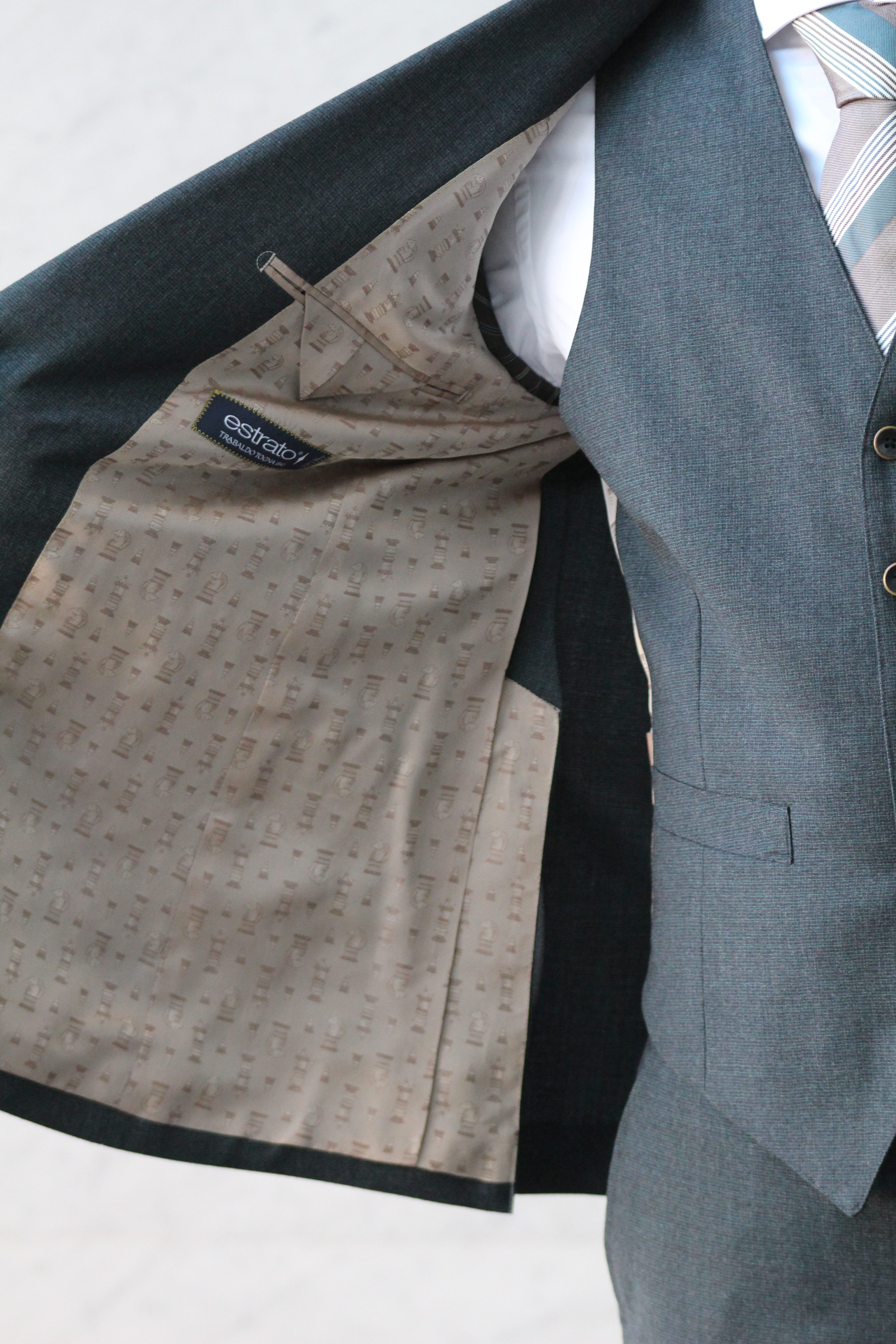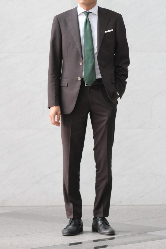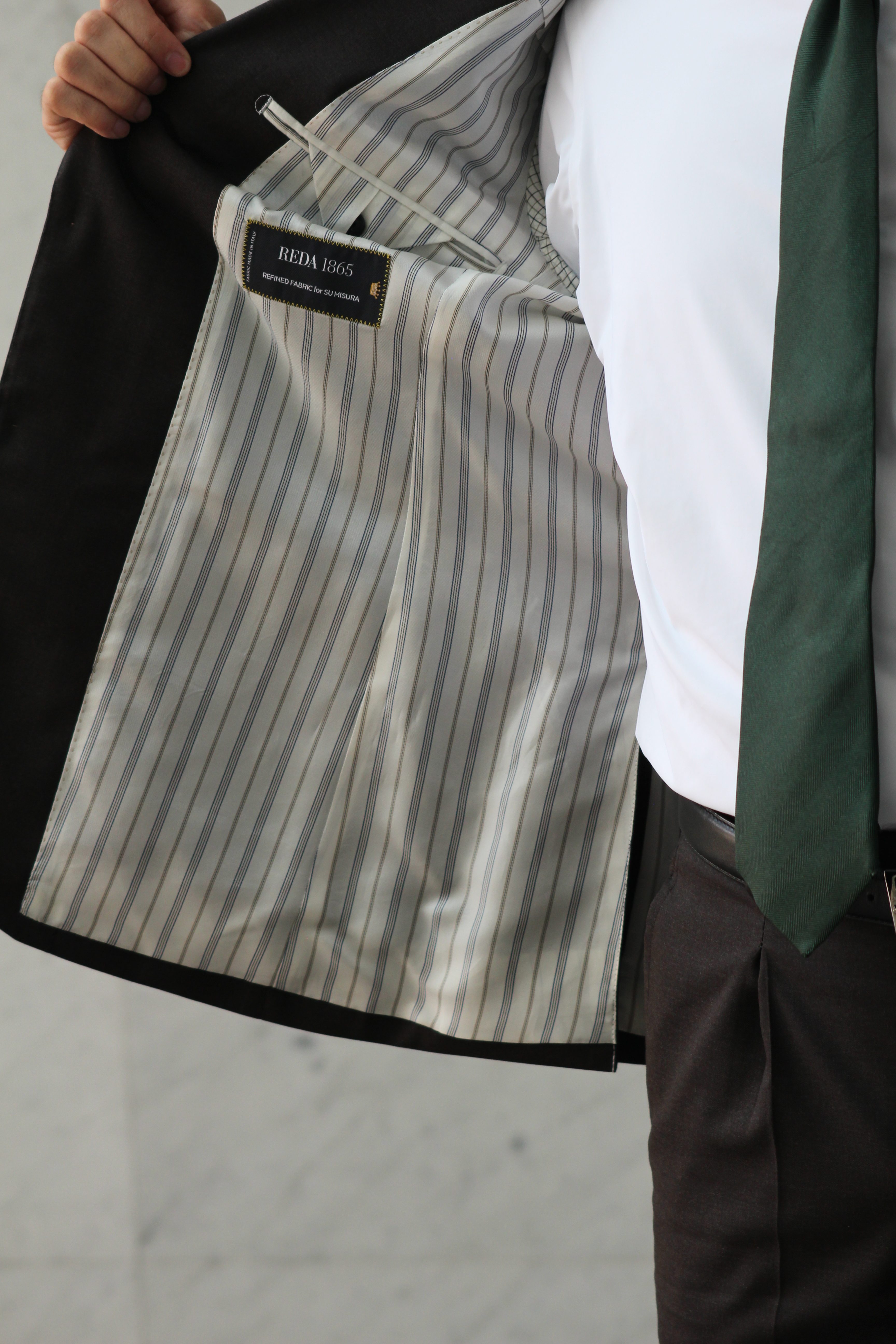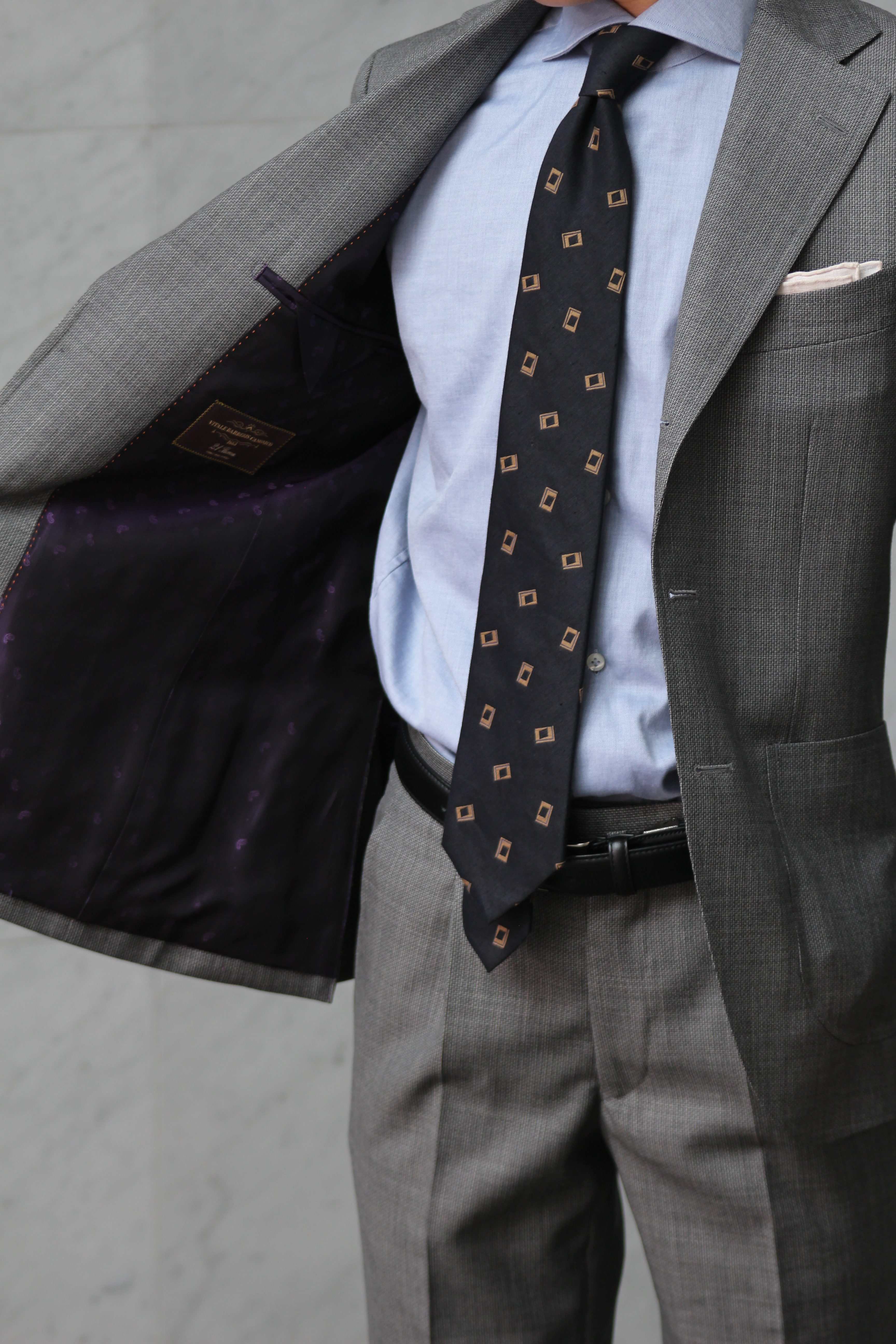 スーツの裏地はベージュで同系色のレジメンタルタイとの合わせで