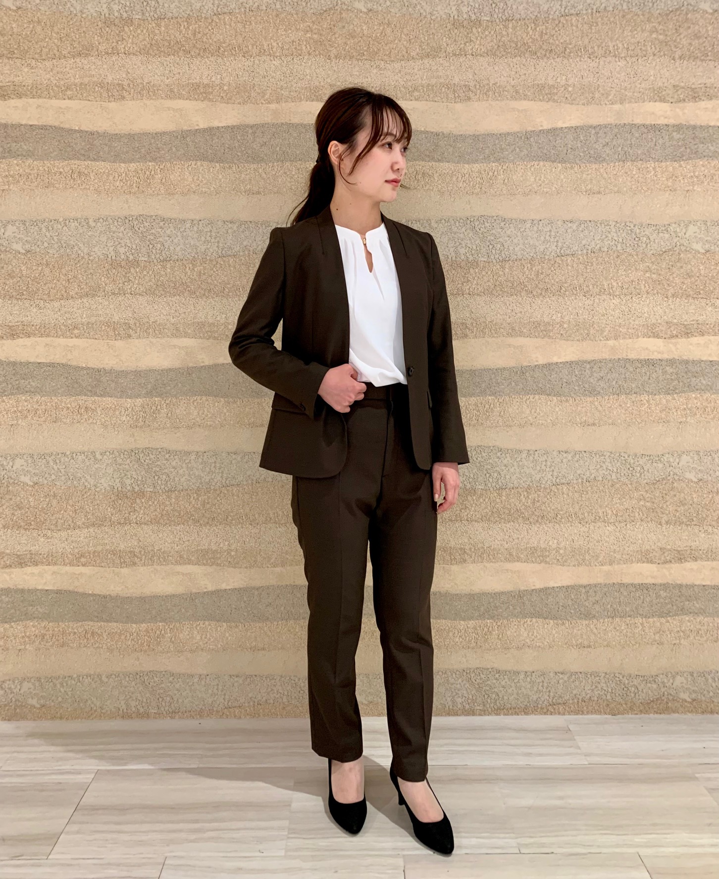 シックな落ち着きのあるブラウンを着用。