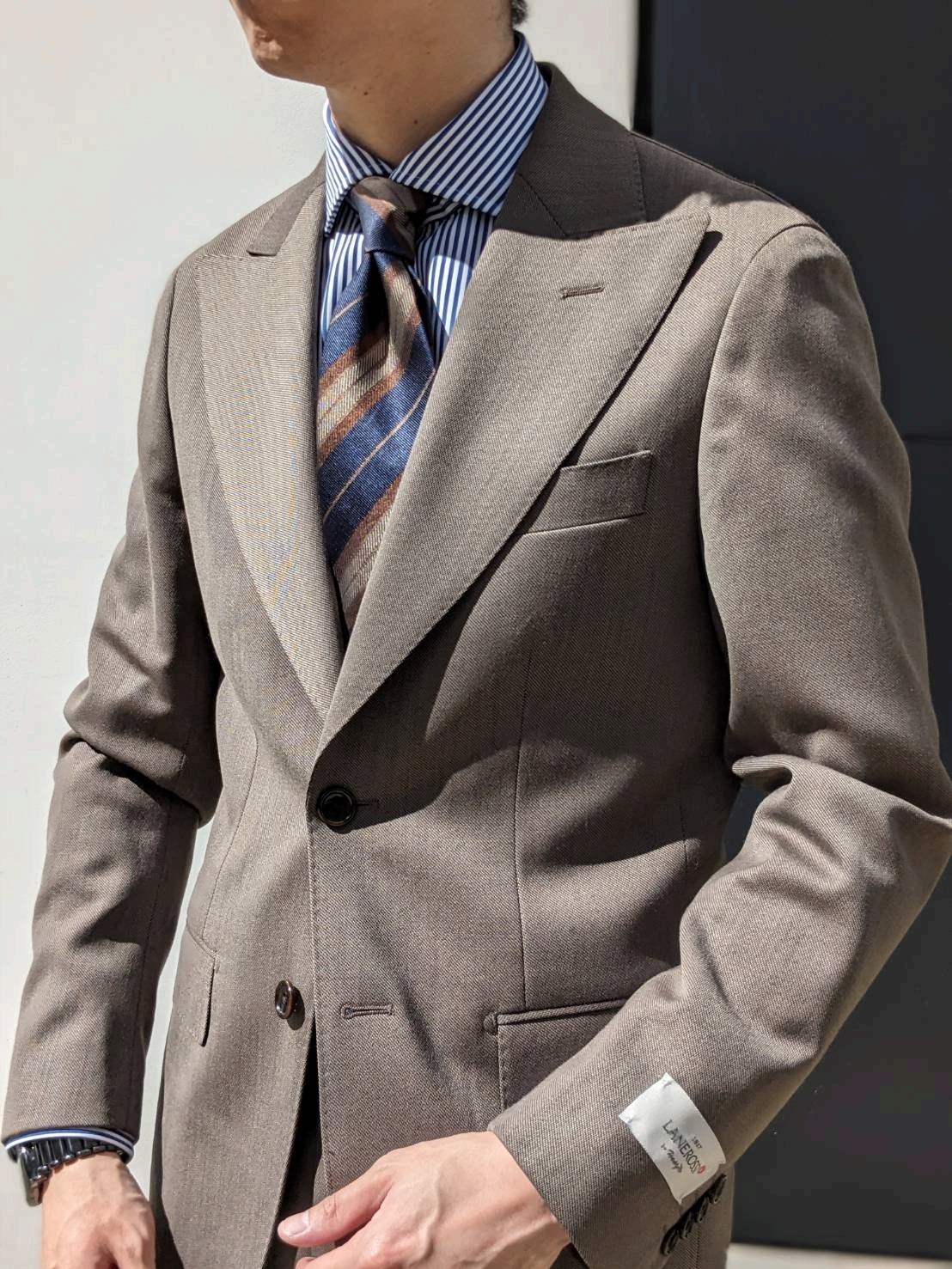ネクタイの配色がスーツ、シャツどちらとも調和のとれるもので構成した点もポイントです✨