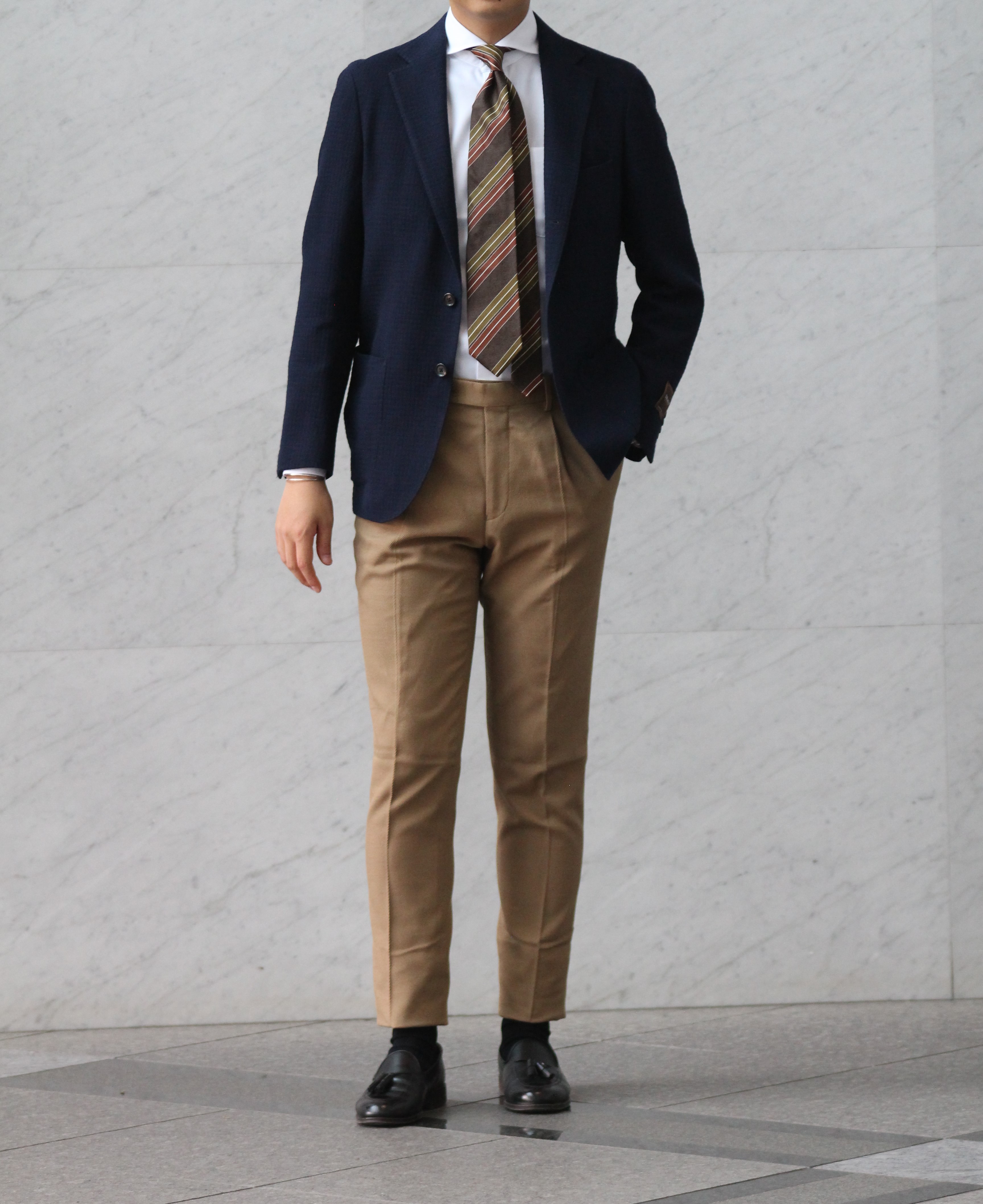 ネクタイからパンツにかけて秋らしい色を取り入れたコーディネートにしてみました。