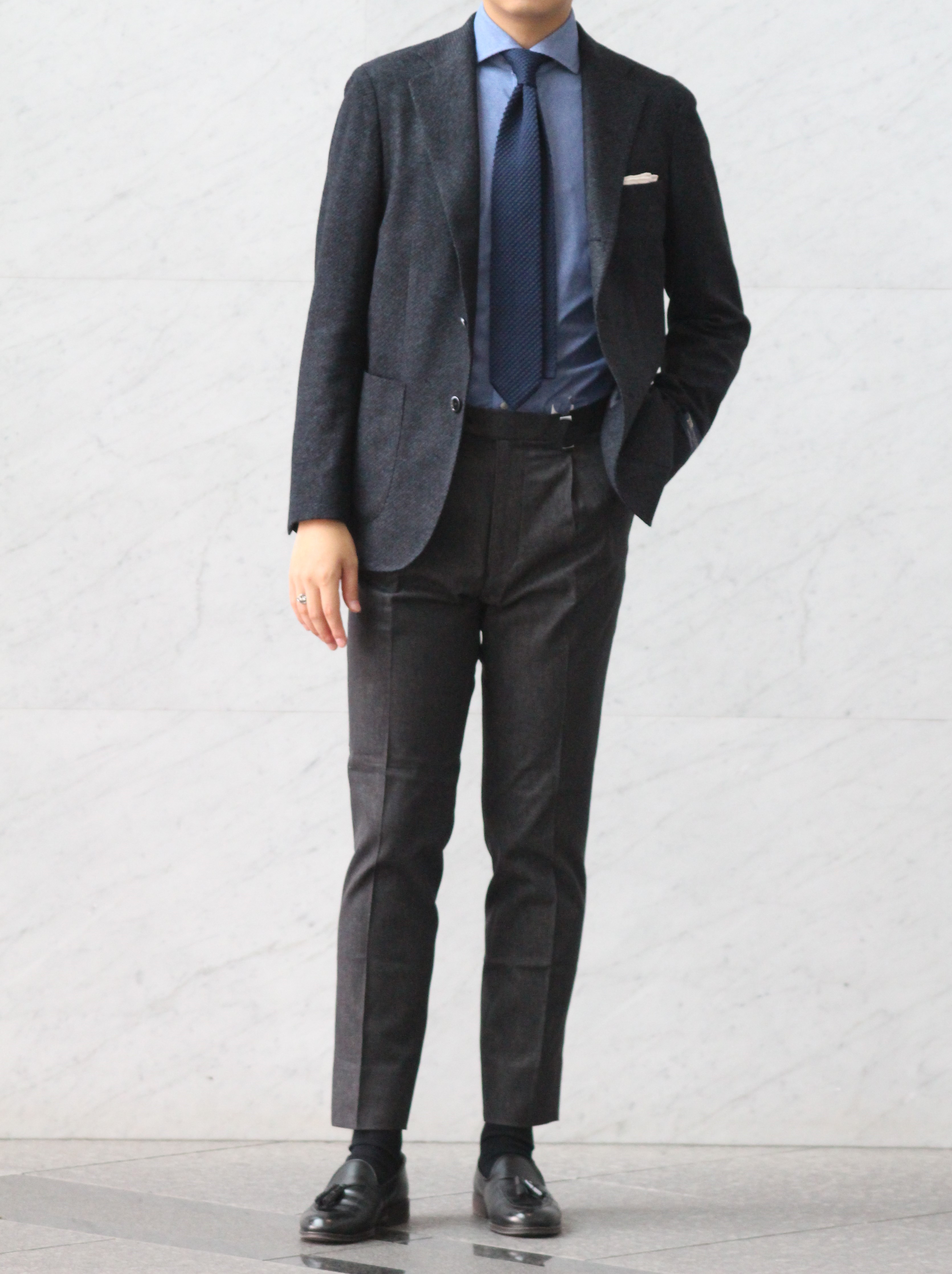 ジャケットを脱いでも様になるシルエットです。