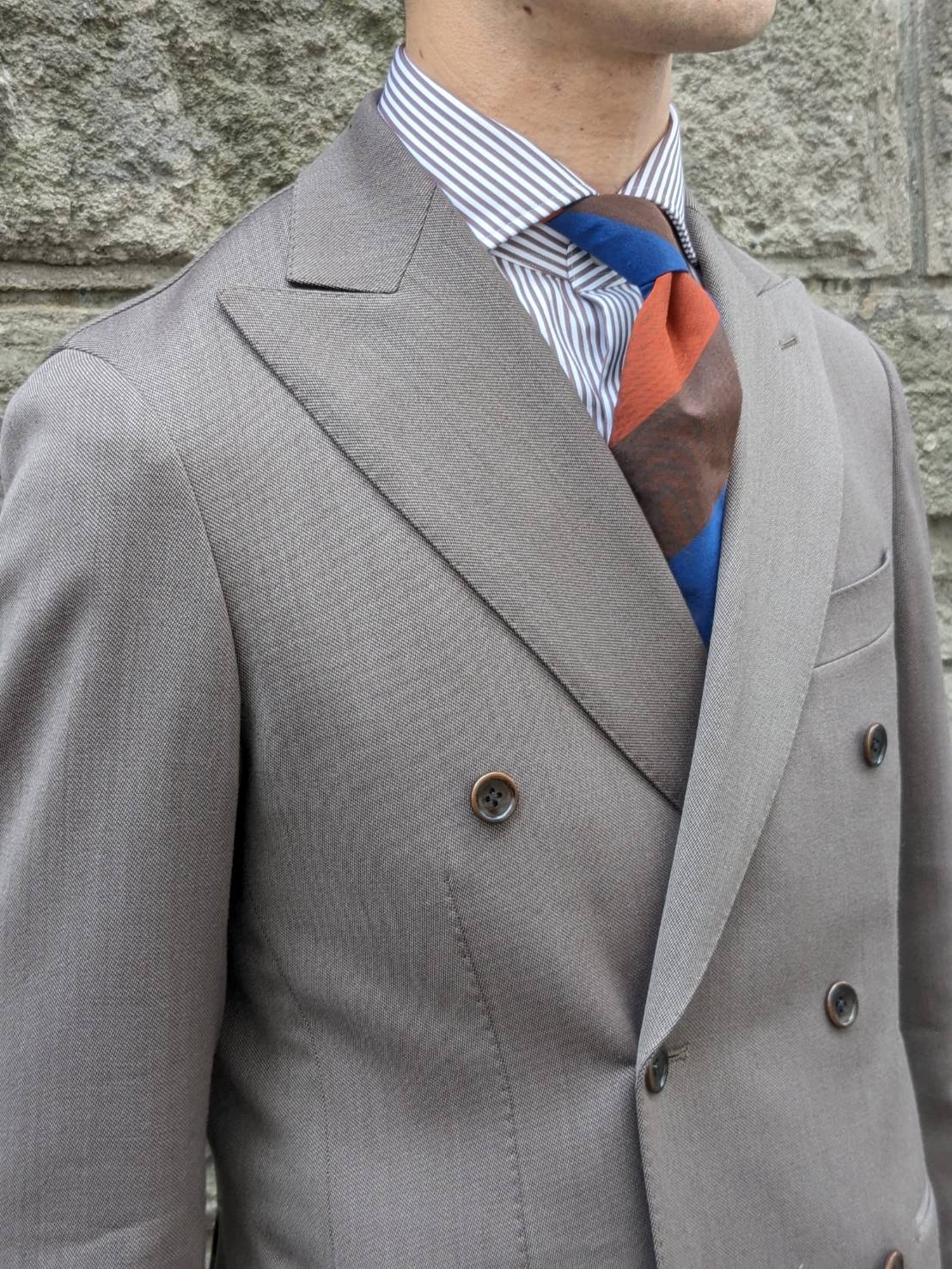 ベージュスーツに良く映えるトリコロールネクタイでコーディネート✨