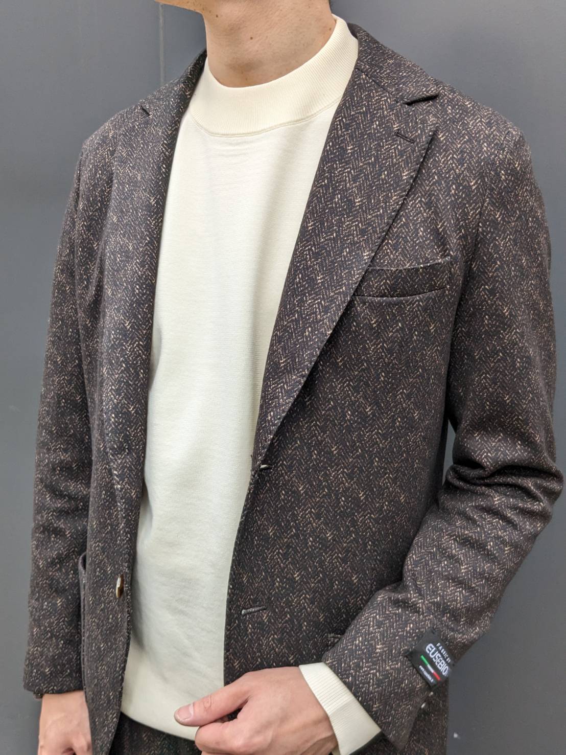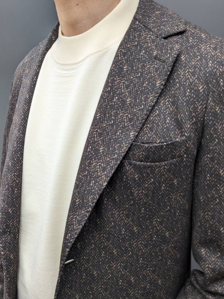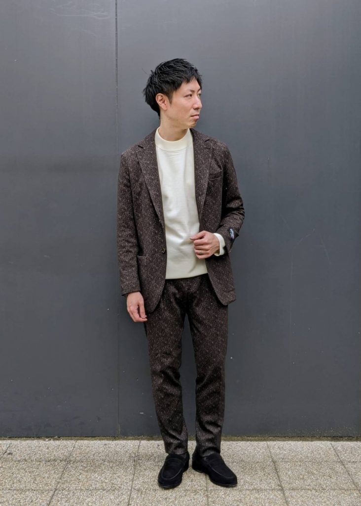 ヘリンボーン柄のブラウンセットアップは伸縮性抜群のイタリアEUSEBIO社製生地で仕立てました✨