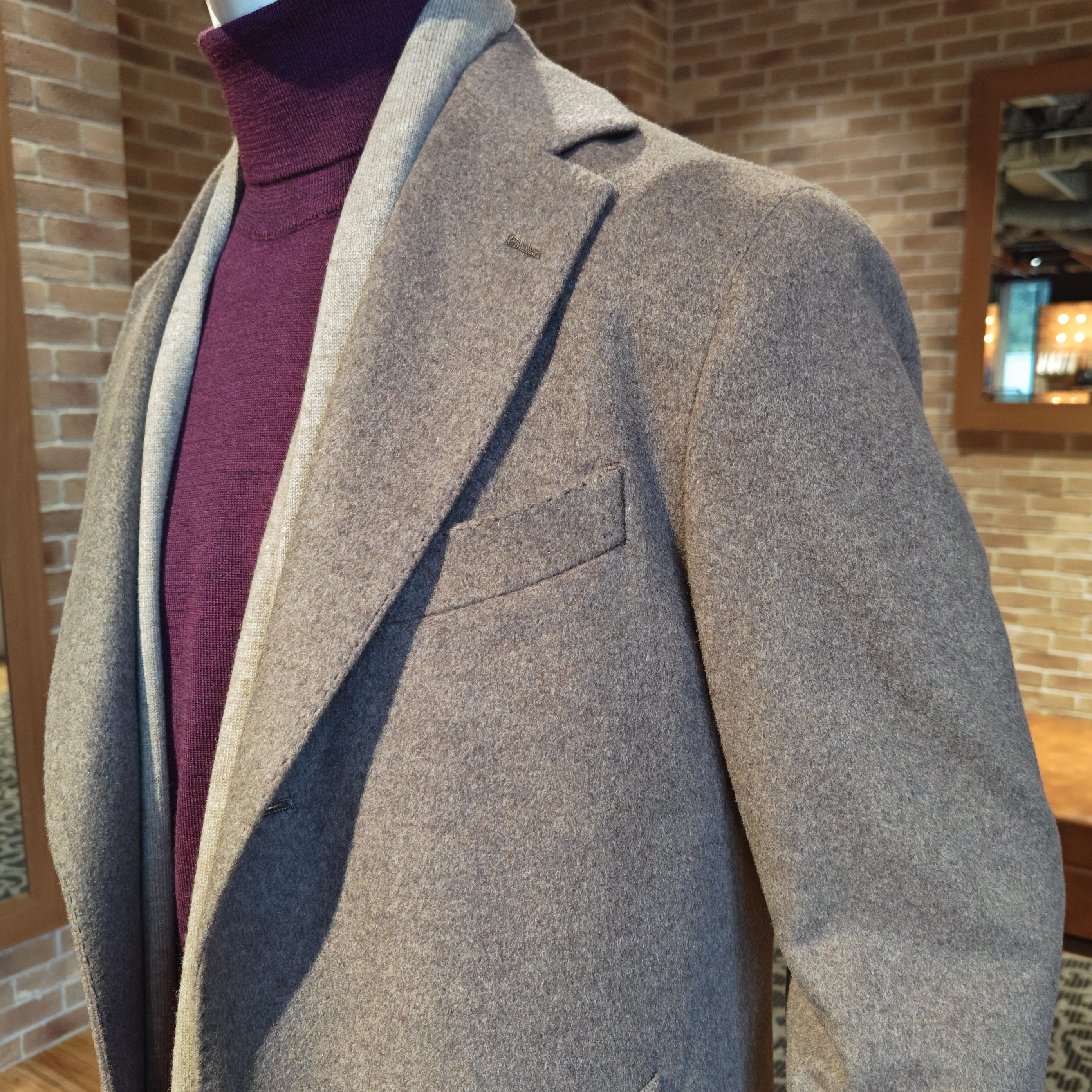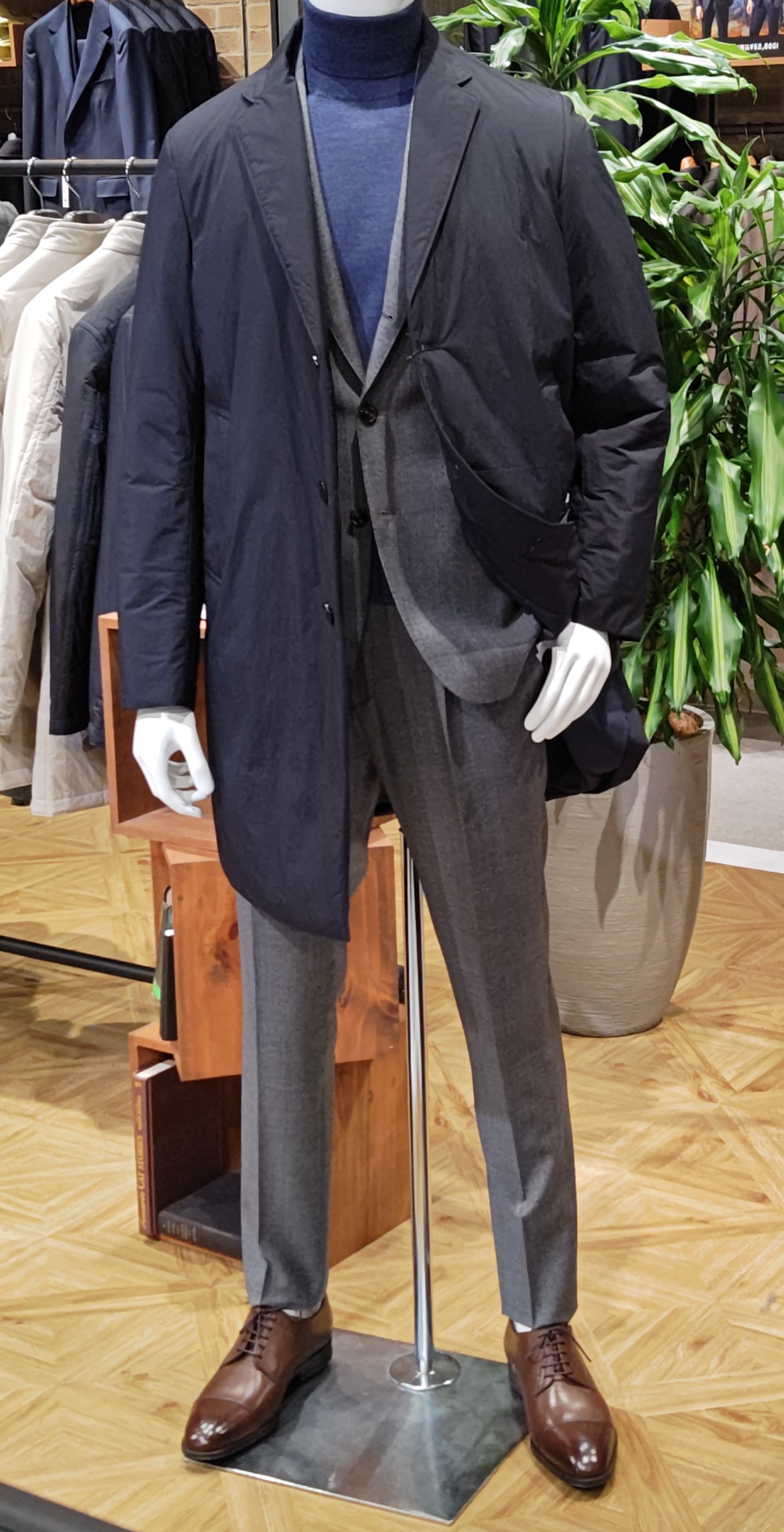 カシミヤブレンドのウール生地でネイビーとチャコールグレーの2色展開。ウールらしく重厚感があって様々なシーンで着用可能でありキチンと感も備えた万能な1着。