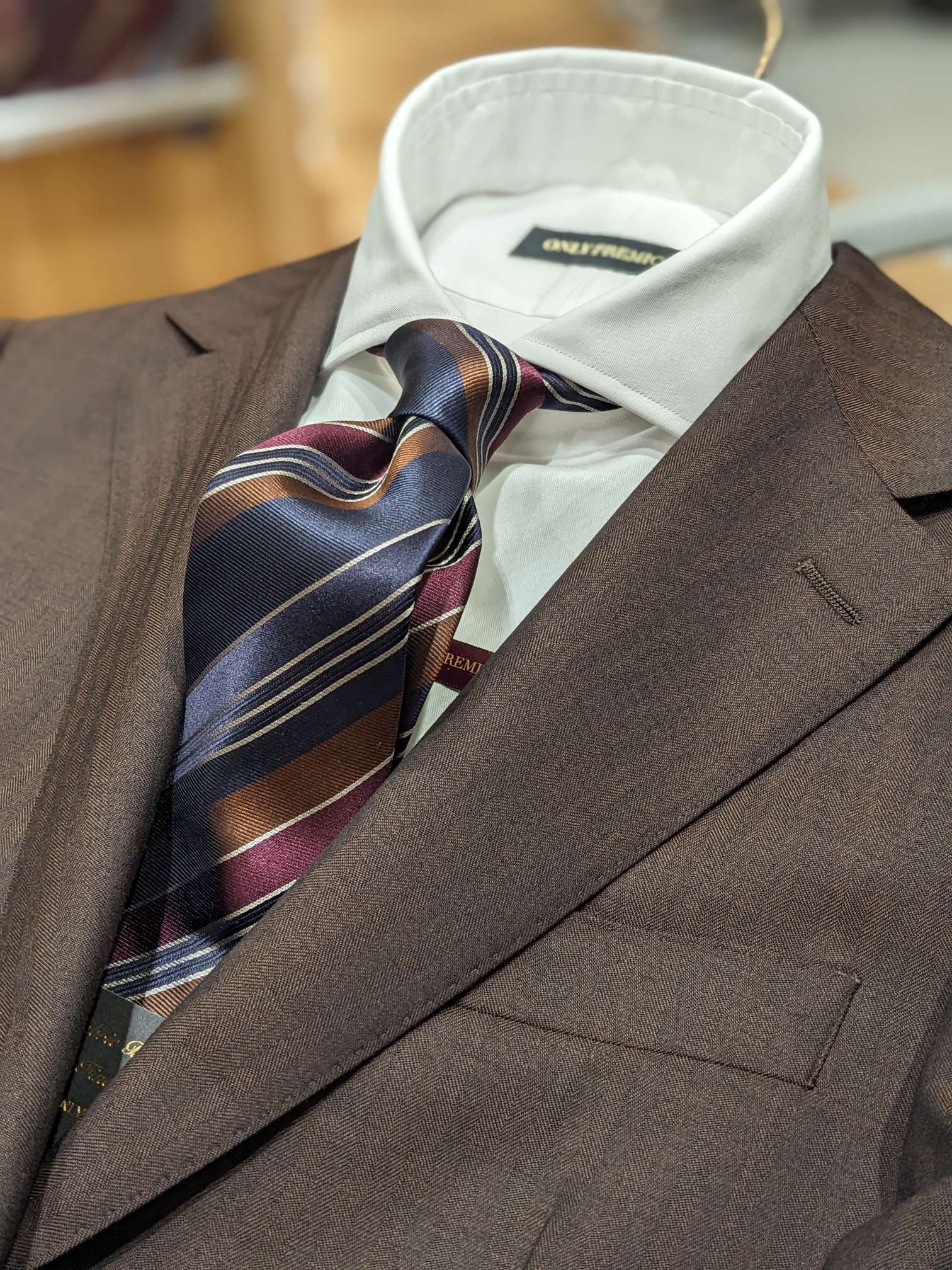 テラコッタカラーのスーツ✕ストライプタイ