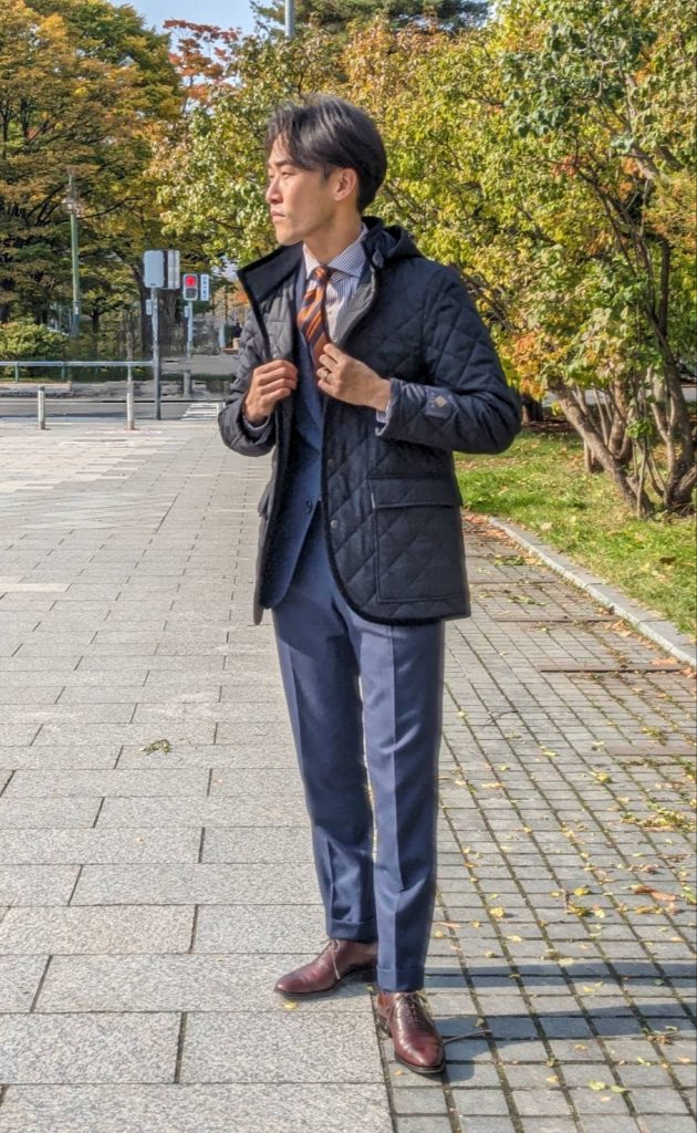 深いネイビーをブルーのスーツに合わせる事でトーンオントーンのコーディネートで