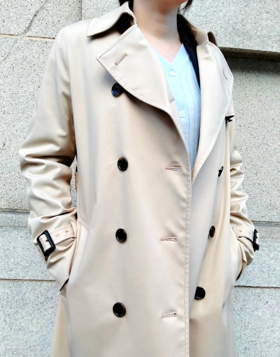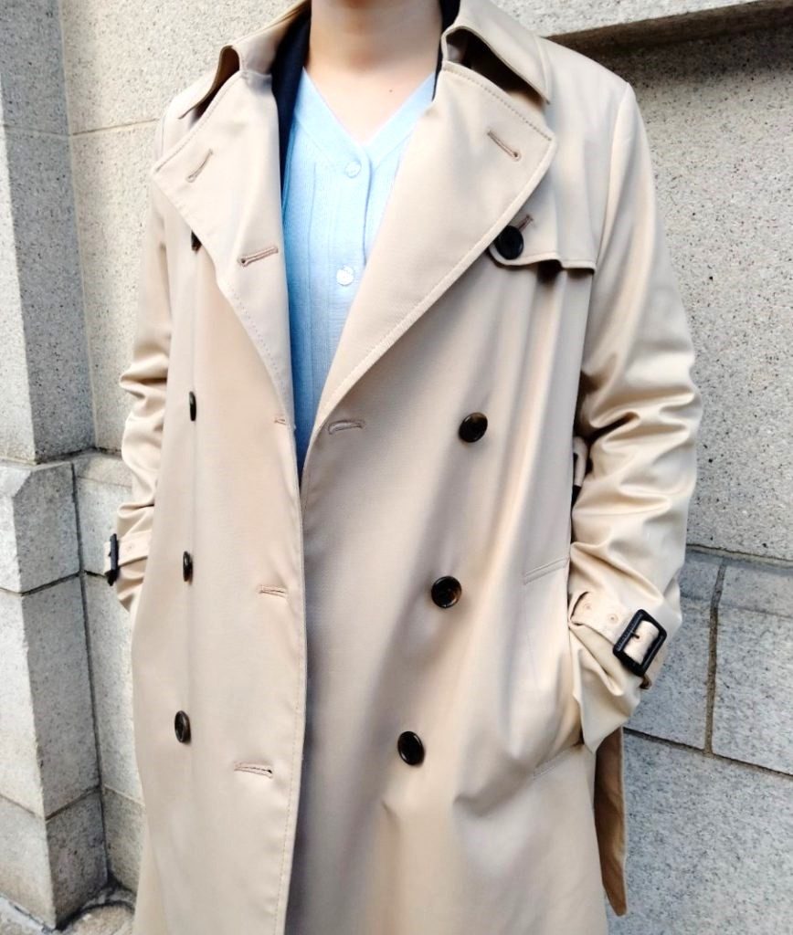 あらゆるコーディネートに合わせやすい、明るいベージュのトレンチコート✨