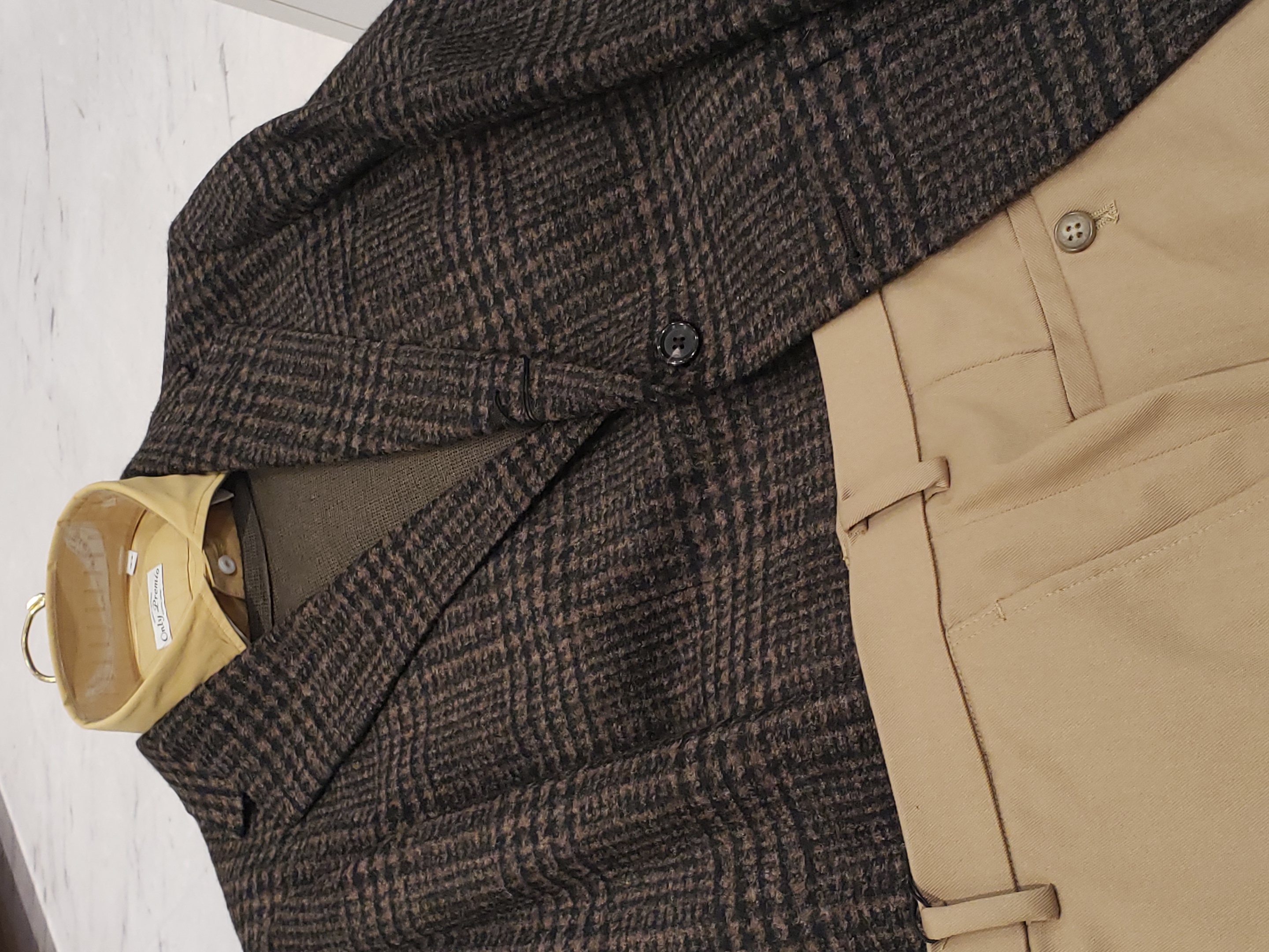 お次はカーキのニットを使用したイケオジ感漂うコーディネートです💚主役のブラウンジャケットを引き立たせつつ、単調にならないようカーキを効かせています。シャツをマスタード色にすることでお顔周りが明るくなり、優しく親しみのある雰囲気に!パンツのお色味もシャツに合わせることで、全体的なまとまりもばっちりです✨