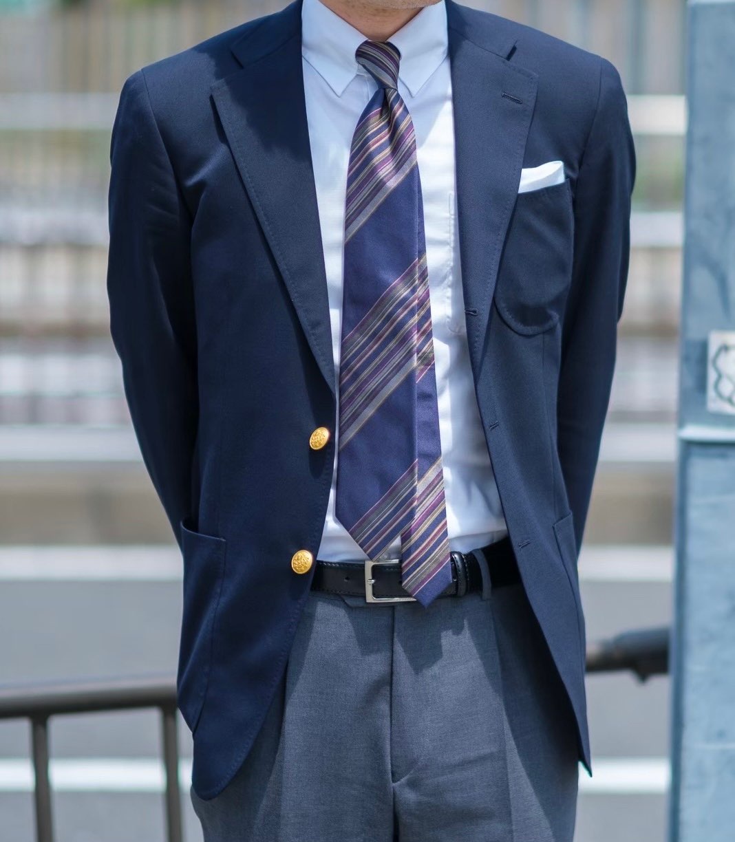 紺ブレ+白シャツ+レジメンタルタイ+グレー無地のトラウザーズ+黒ローファー👔