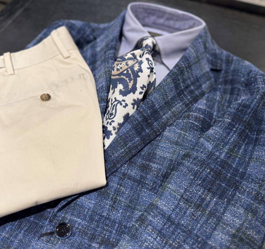 コットンライクな素材感のジャケットにブルーのボタンダウンシャツ、ネクタイに白×ブルーのペイズリーと二色でまとめ上げたコーデです。