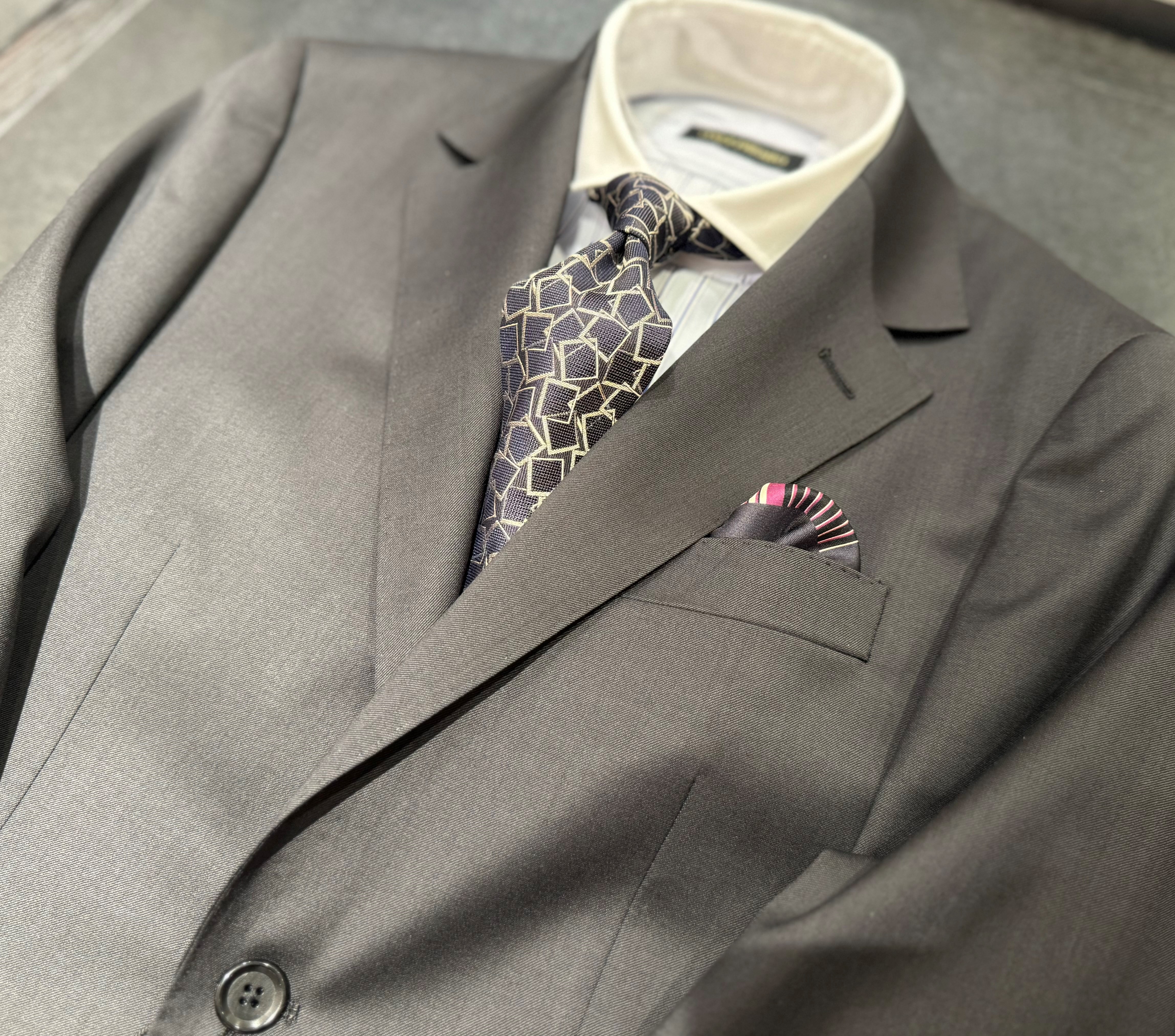 かなり深めのダークグレーにブルーグレーのシャツ、更にグレーの幾何学模様タイを組み入れたトーンオントーンコーデです。