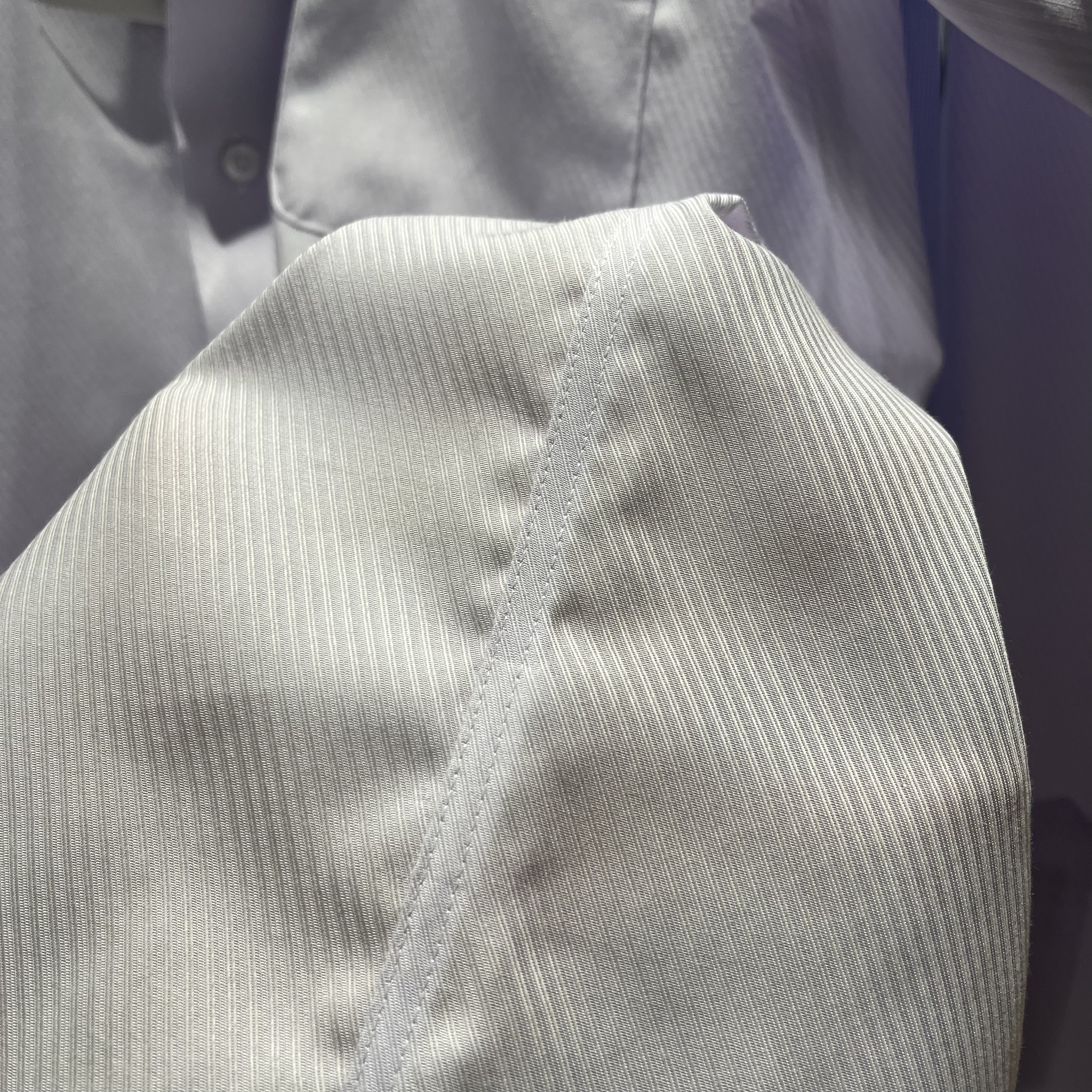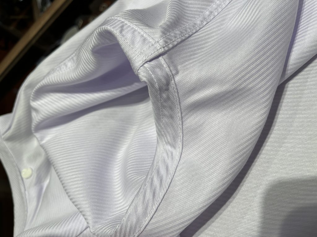 ドレスシャツの本格縫製である「袖付け本縫い」、「脇二本針」の仕立てでノーアイロンを謳う為、特殊なテープを袖付けと脇の縫い目に施し、パッカリングを防止。