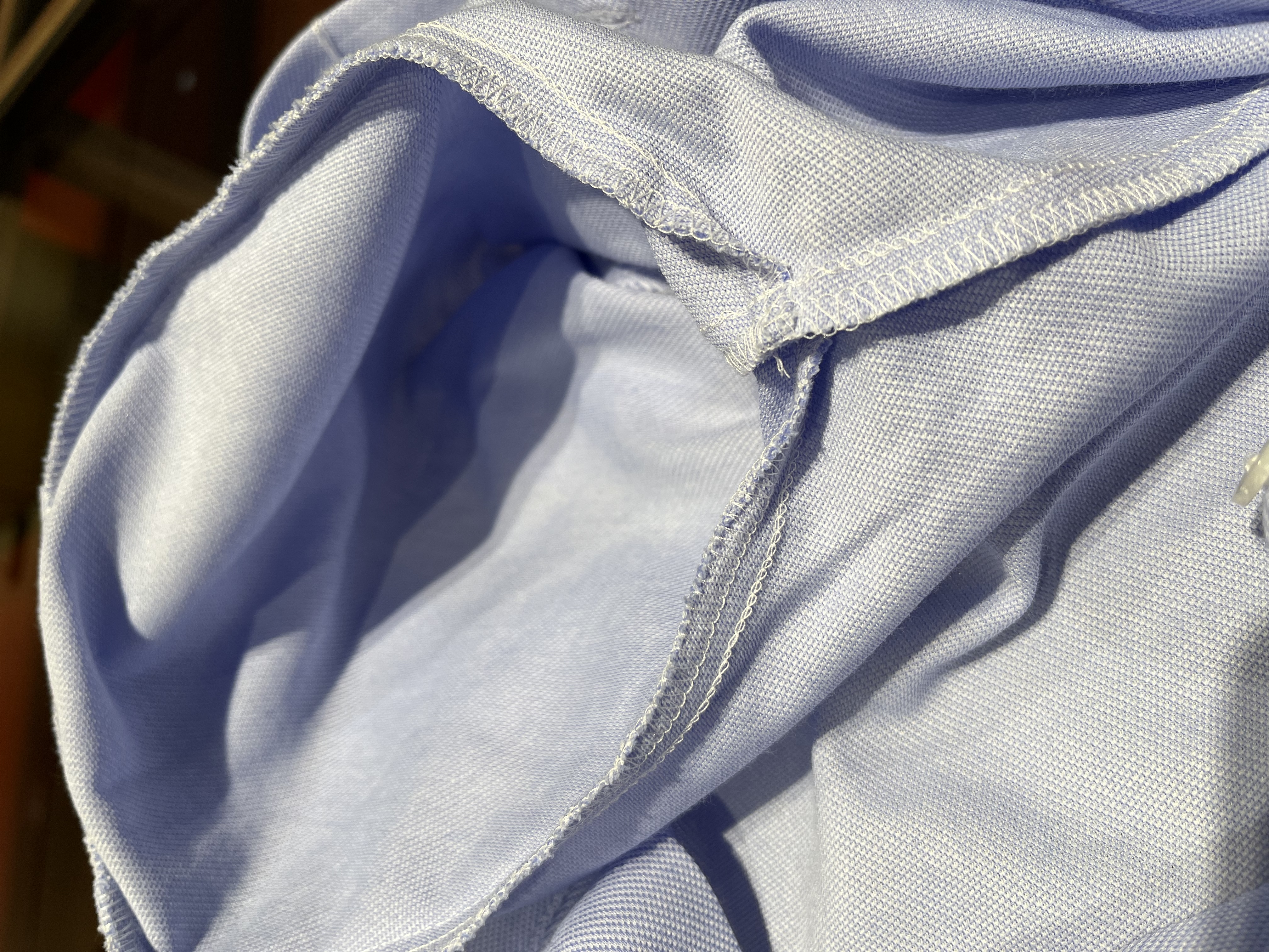 内側から見るとわかりやすく、ロック縫いに比べ、生地の端が巻き込まれているため、肌あたりが良くなります。👍