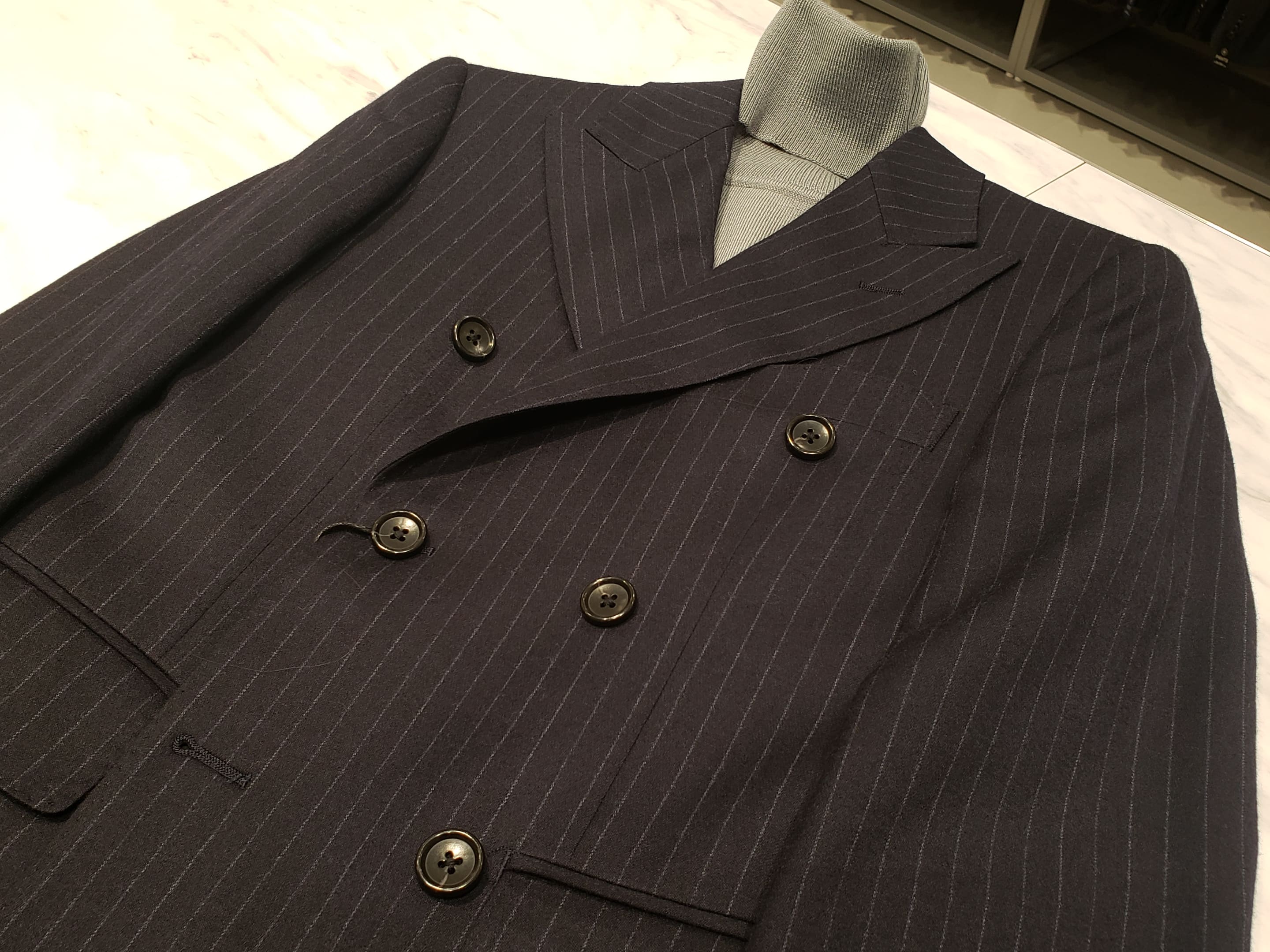 お色味は定番の紺ブレ、なのですが前回ご紹介した6つボタンのものと違う点に皆さまお気づきでしょうか?
