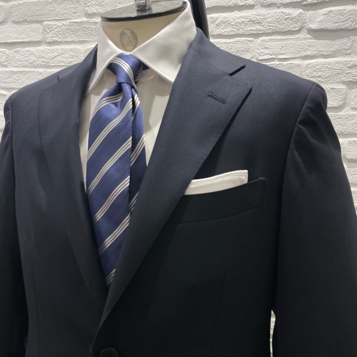 メインのスーツは西川毛織のウール100%生地を使用。上品な光沢があり、ポリエステルが入ってる生地とは全然印象が違うんです!!