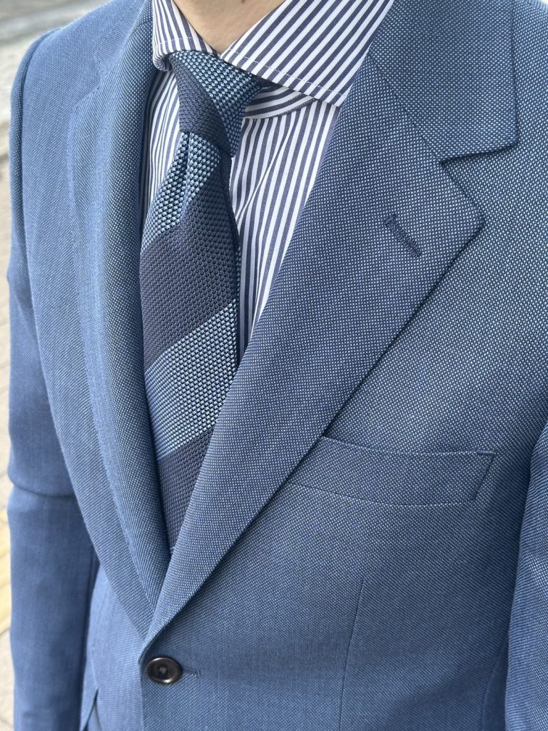 今回はフレスコ織りの粗い生地目が特徴のネクタイをチョイス✨