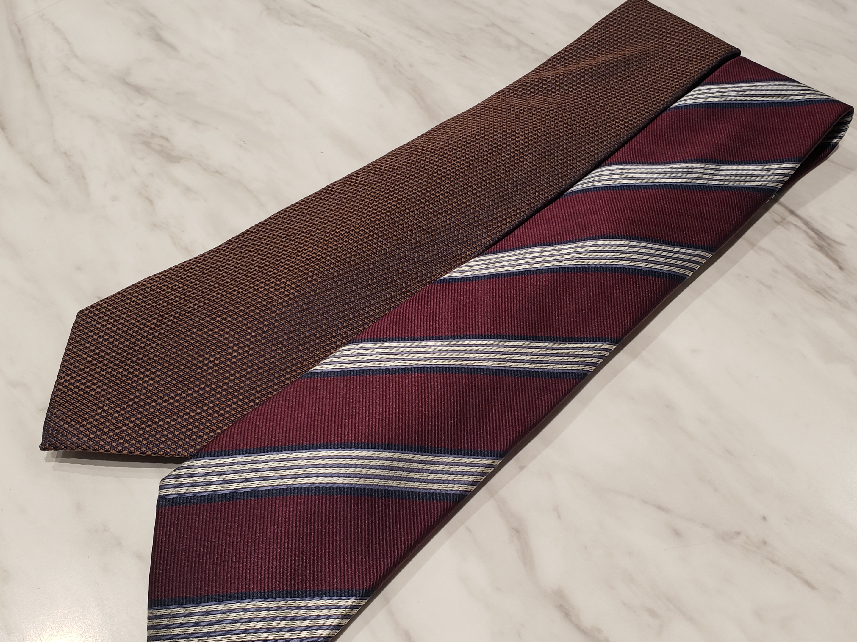 レッドのレジメンタルはプレゼンで気合を入れたいときに・・・ブラウンはクライアントに信頼感や落ち着きを見せるために・・・など、ネクタイの可能性は無限大💡💡