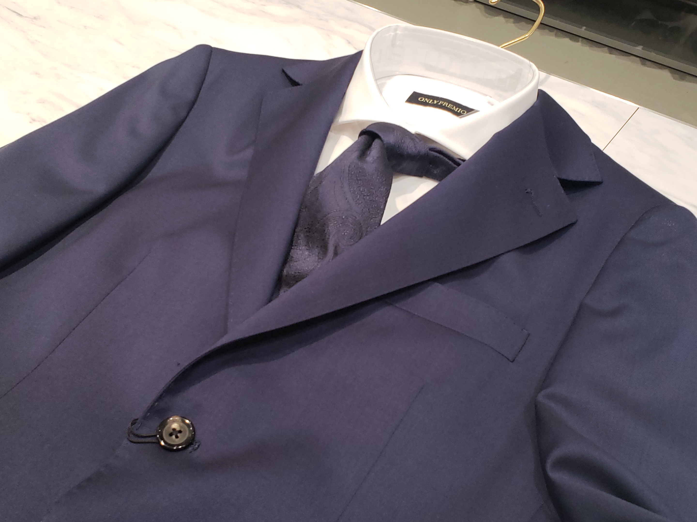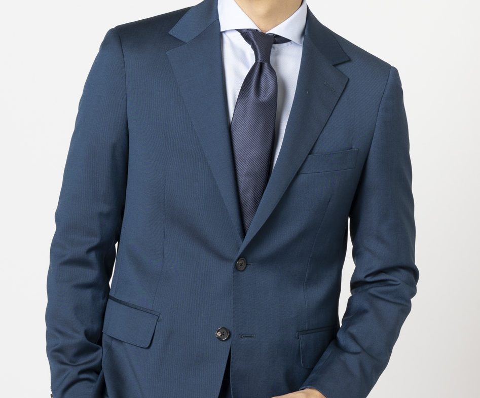 こちらのスーツ、結婚式のようなセレモニーにふさわしい光沢感に加えてストレッチ性能まで兼ね備えた優れものなんです・・・!もちろん、ビジネスの場でもお使いいただけます!