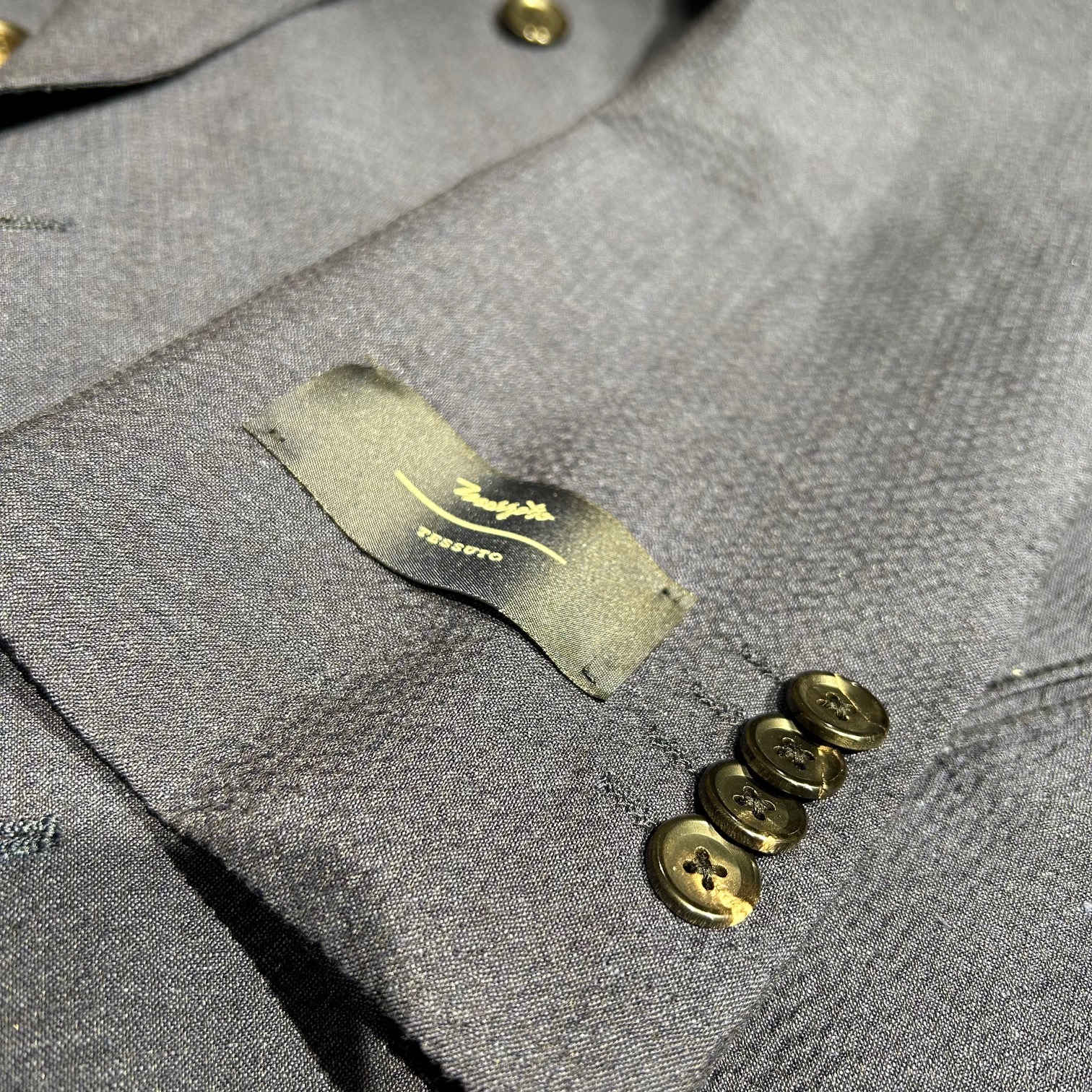 ポリエステルを入れているのでウール100%とは違ったメランジ感があり、生地感も相まって軽快に着られるスーツです。