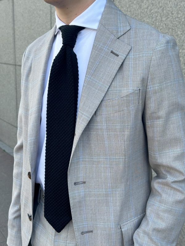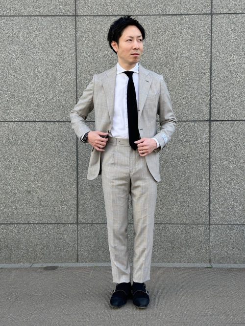 Vゾーンは今回白シャツとブラックのニットタイで構成しシンプルながらも遊び心ある