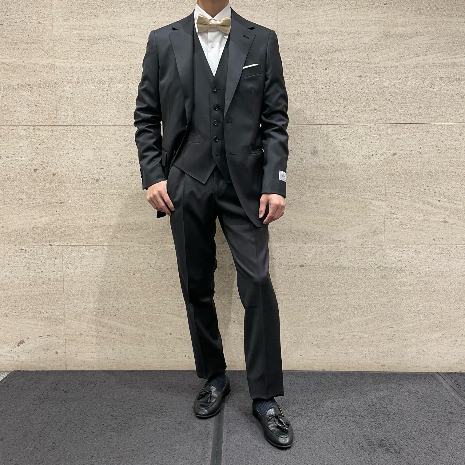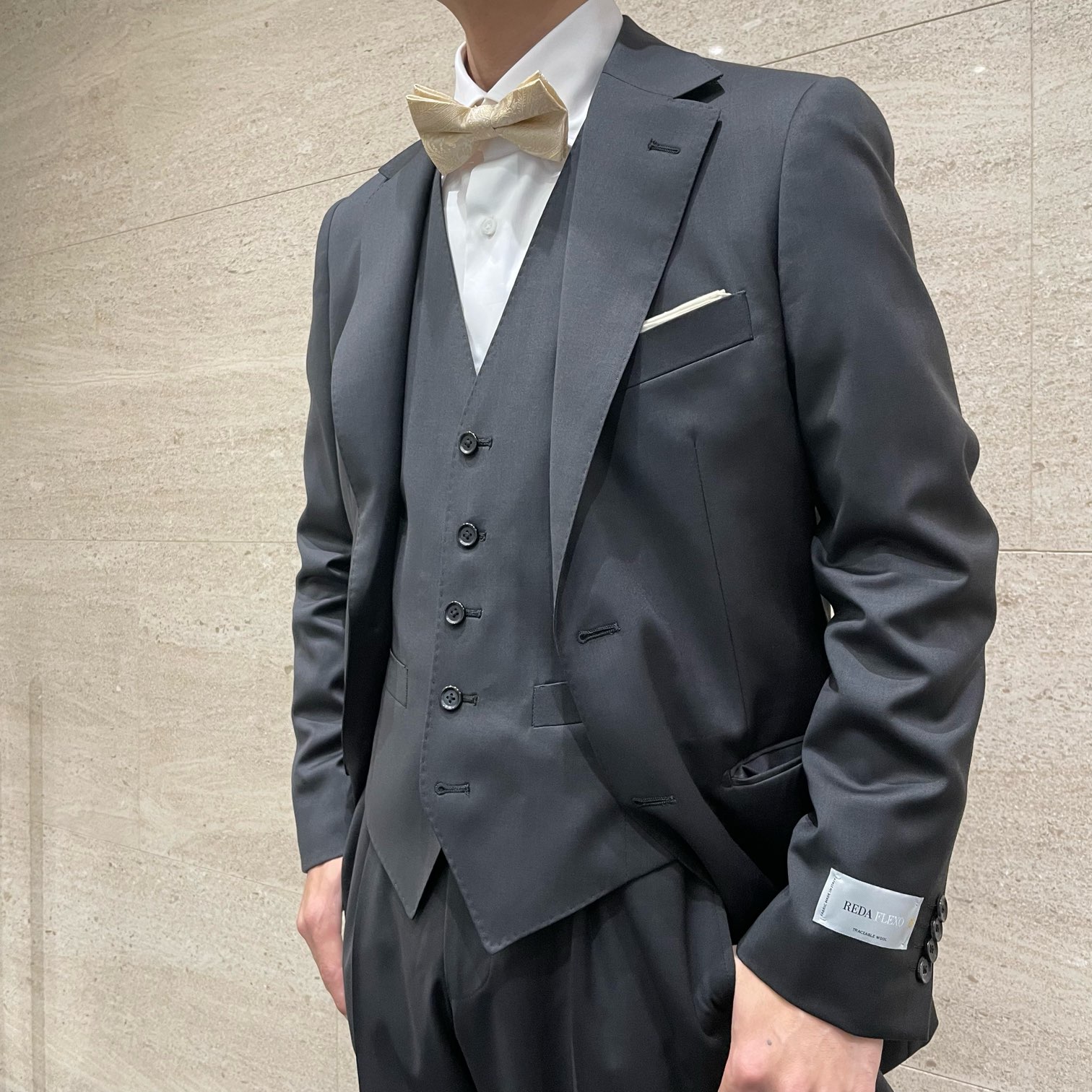 チャコールグレーのスーツにゴールド系の蝶ネクタイで華やかさのあるコーディネートです✨