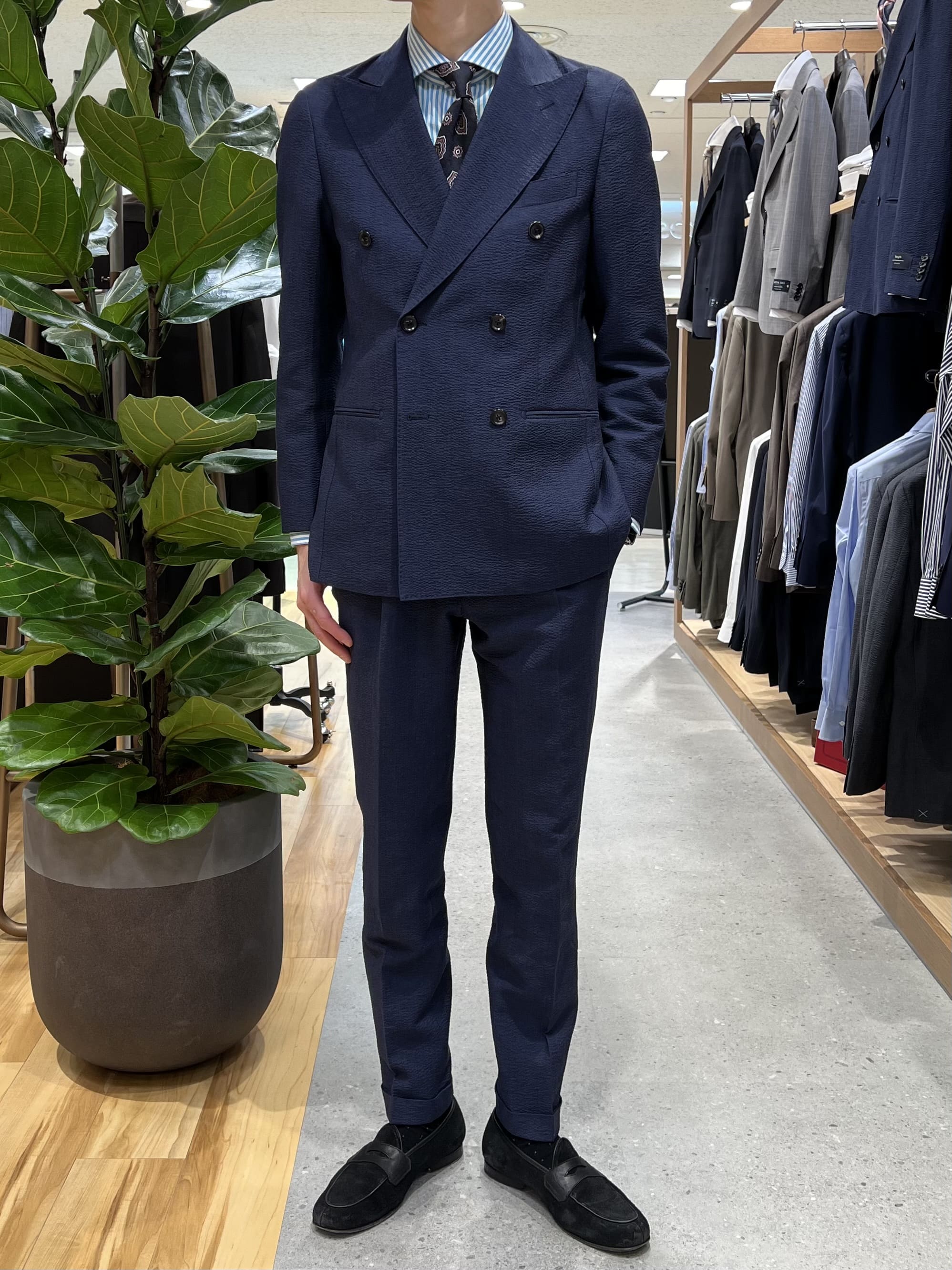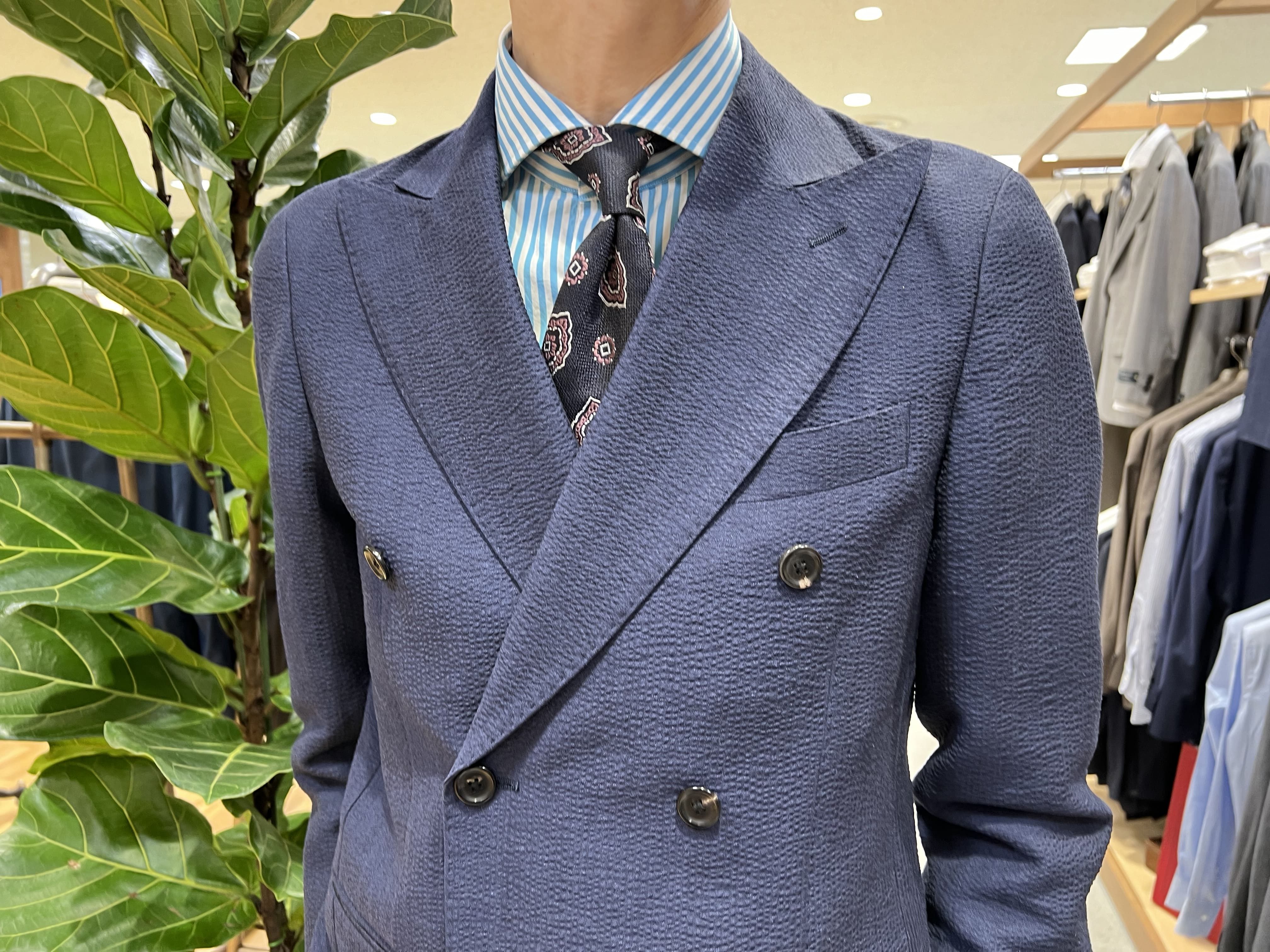 表面の凹凸感によって肌への接着面が少なくなり、通気性も手伝って涼やかな着心地を味わえるシアサッカー生地の新作スーツが入荷いたしました🎐