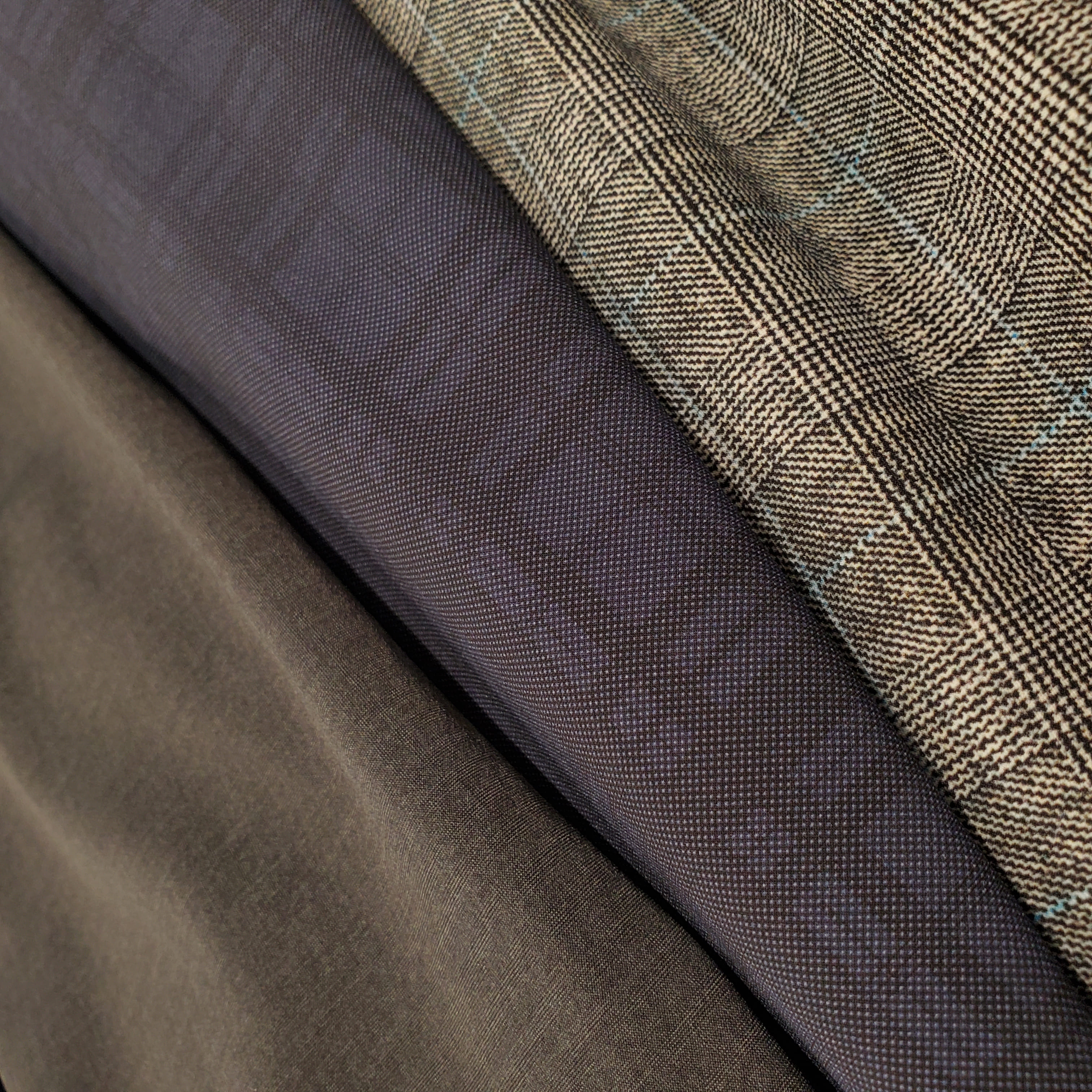 ライトグレーのグレンチェックに明るいブルーのオーバーペンを配した、春夏らしい爽やかな1着です。