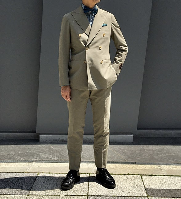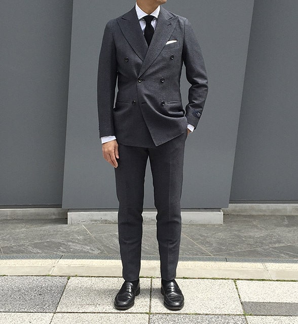 では、本題に戻ります。今回のテーマは「ダブルブレスト」です。オススメのスタイルを2パターンご覧いただきます。最後まで何卒宜しくお願いいたします。