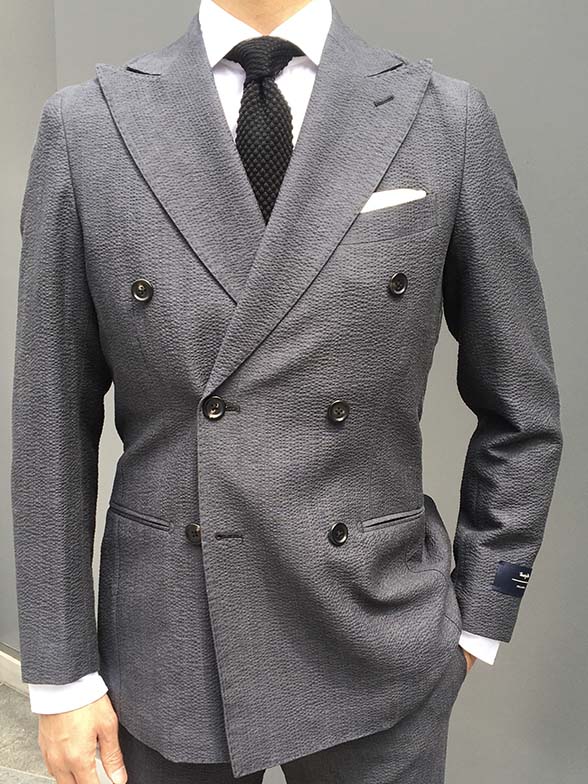 ウールにリネンを混紡した珍しいシアサッカー生地。まず見た目が涼しげ。そして弊社独自の「サンタルチアZERO」仕様で毛芯がないため、軽量で快適な着用感。シックな佇まいとシャープな印象がオススメのポイント。お仕事帰りに雰囲気のあるレストランに行きたくなる「オトナの夏のスーツ」です。