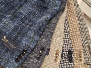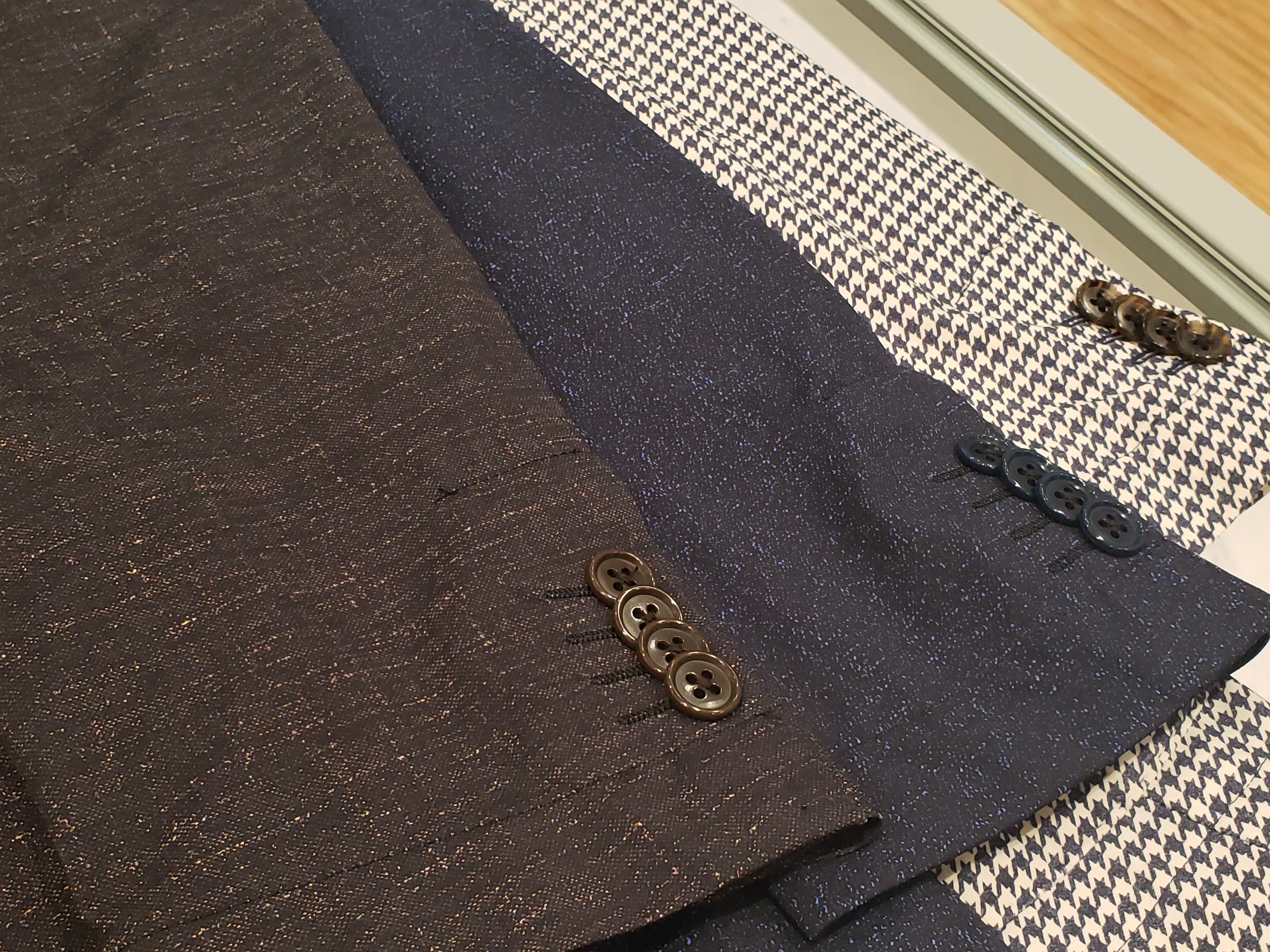 一番人気はブラウンなのですがビジネスの定番色であるブルーも普段さらっと羽織りやすく、千鳥柄は華やかでエネルギッシュな雰囲気にピッタリです◎