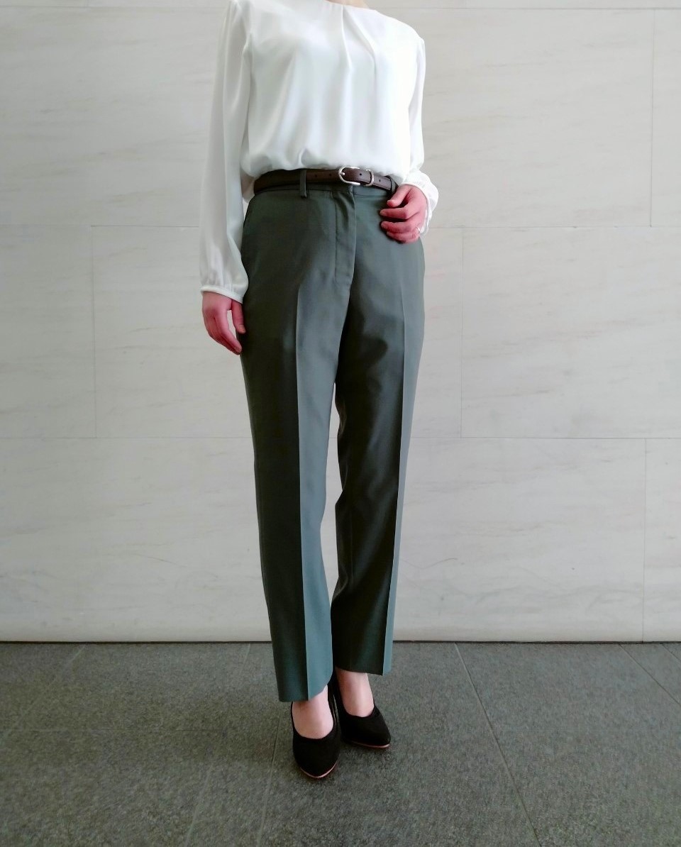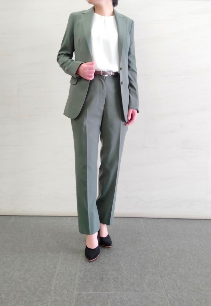適度にゆとりのあるデザインなので快適な着心地のグリーンスーツと、タック入りホワイトカットソー✨