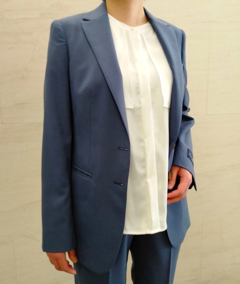 鮮やかなブルーの色味が新鮮な2つ釦スーツと