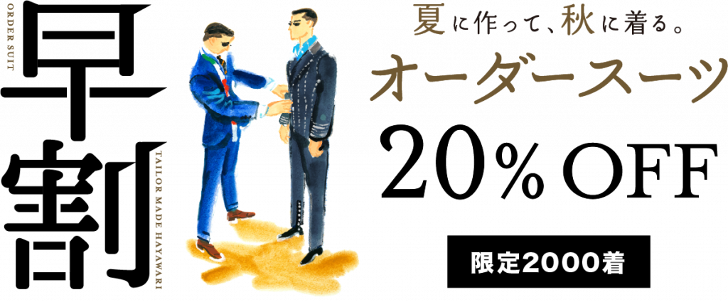 早割とは・・・お仕立て期間を最長二か月頂戴いたしますが生地代金から20%オフでオーダースーツをお作りいただけるとってもお得なキャンペーンです!