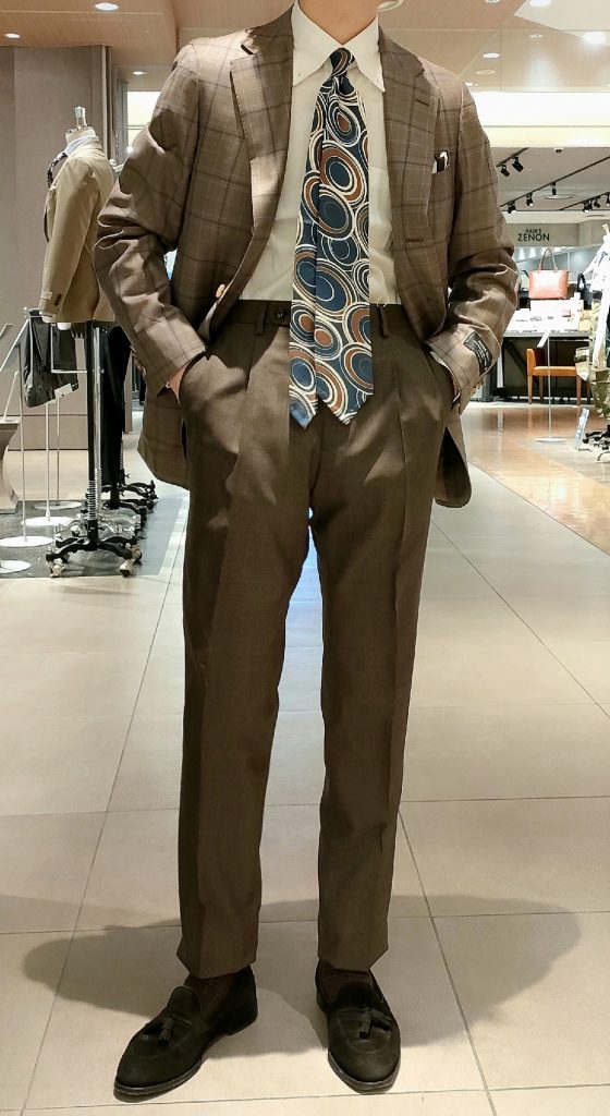 ■着丈眺め・大きめ(ウエスト絞りが甘い)のジャケット=ワンタック又はツータックのストレート~ややワイドのパンツ(裾幅20cm~)で裾がしっかり靴に乗る程度