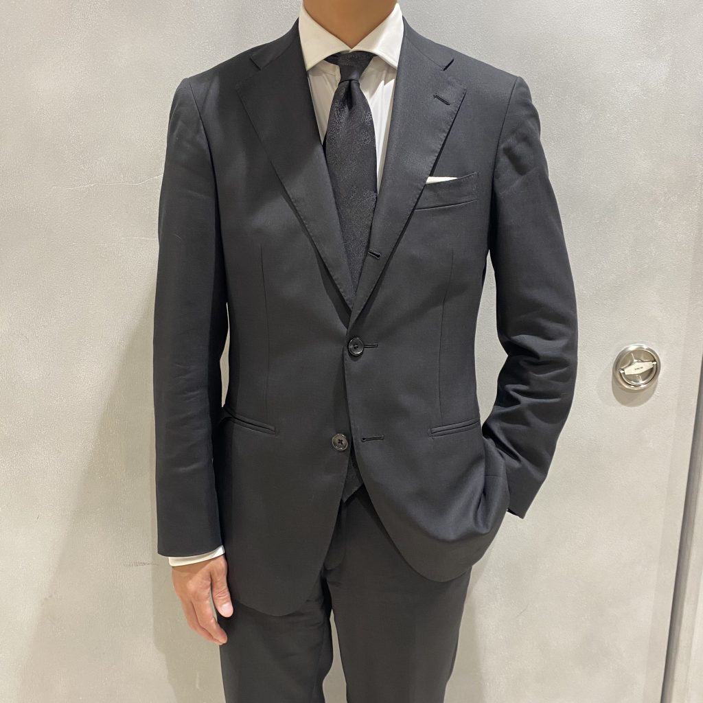 特徴は、糸にする前に繊維を染める技法「トップ染め」を用いて、一般的なグレーのムラ感を極限までに抑えた生地になります。キチンとしたダークカラーの色味に加え、光沢感があるためビジネスだけではなく、ブライダルやパーティーにもご着用いただけます。インポート生地に引けを取らない逸品です。更におすすめポイントとしてこちらのスーツは270g/mのウェイトで、オールシーズン着ていただけるため、永くご愛顧いただけると思います。