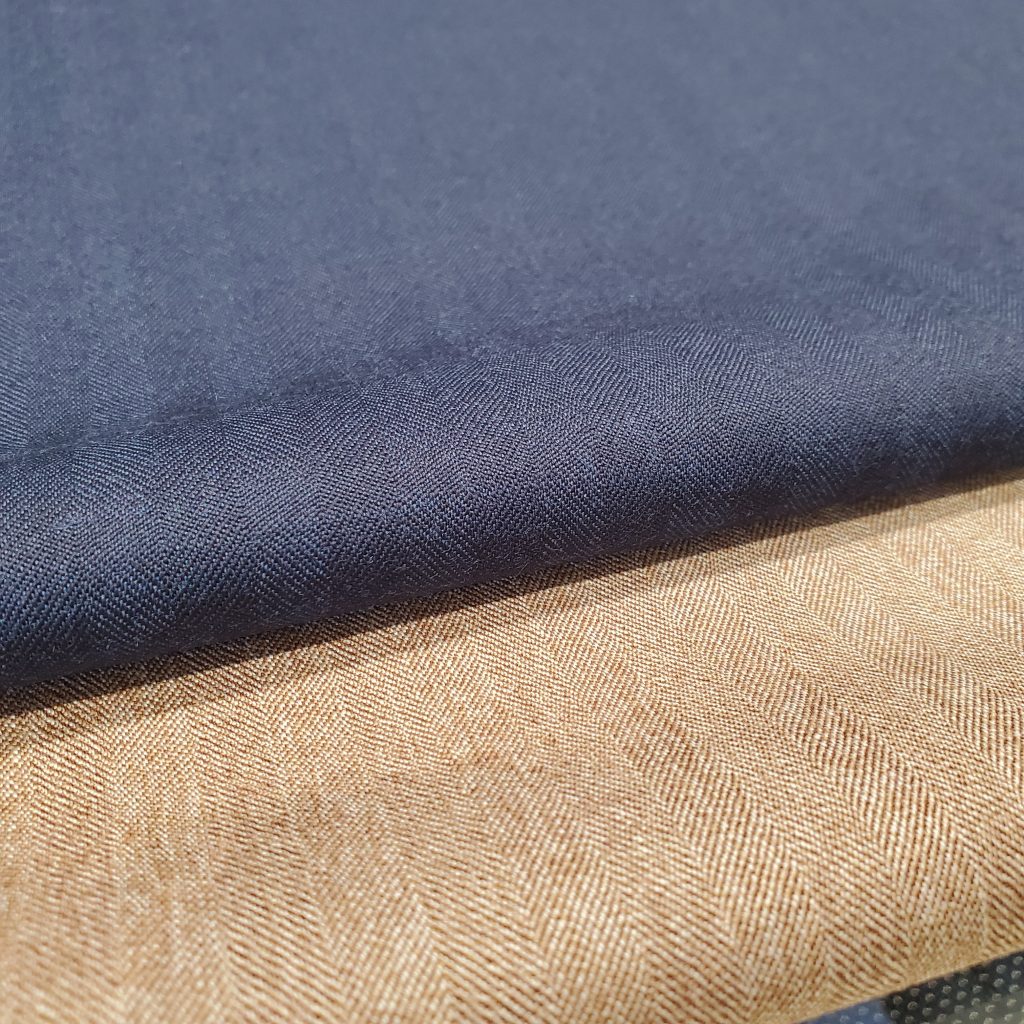 過去のアーカイブより着想を得たヘリンボーン柄は、伝統的なソラーロ(異なる色目を経糸と緯糸に使い、光の加減で色合いに奥行きが出る生地)使い。上質さが一目でわかる清潔感ある光沢と、太番手の糸で織り上げたハリコシのある生地感が魅力的です✨