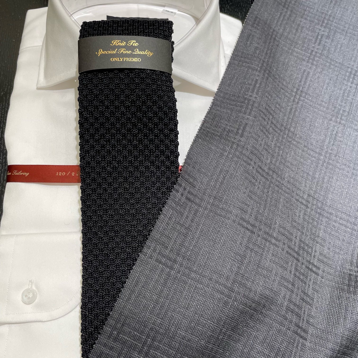 白シャツ・黒のニットタイなんかで合わせてもらうとカッコよく仕上がるかと思います👍