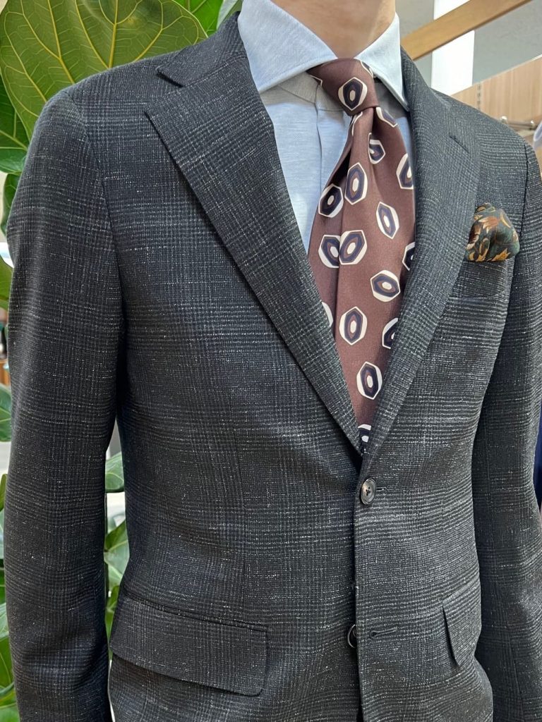 グレンチェック柄にネップ調(繊維がからみ合ってできた糸のかたまり)の節が特徴的で落ち着いた洒落感のある印象を与えてくれるスーツとなっております!