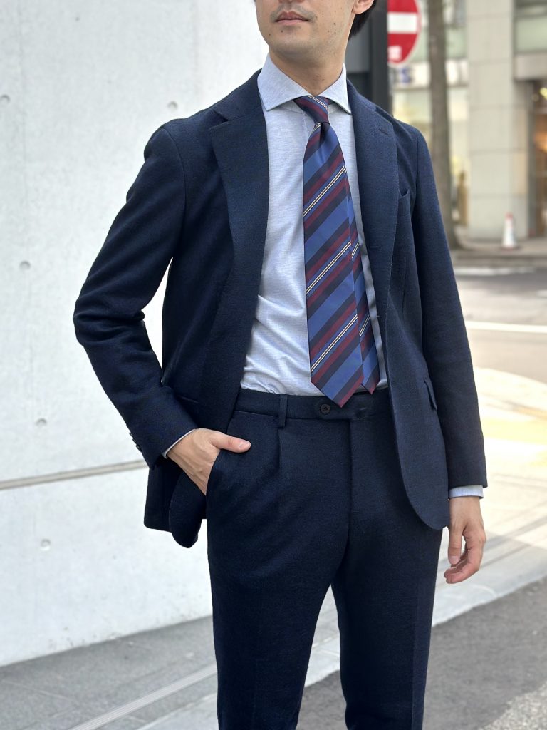 Vゾーンをレジメンタルタイで飾ることで、軽やかな着用感はそのままに