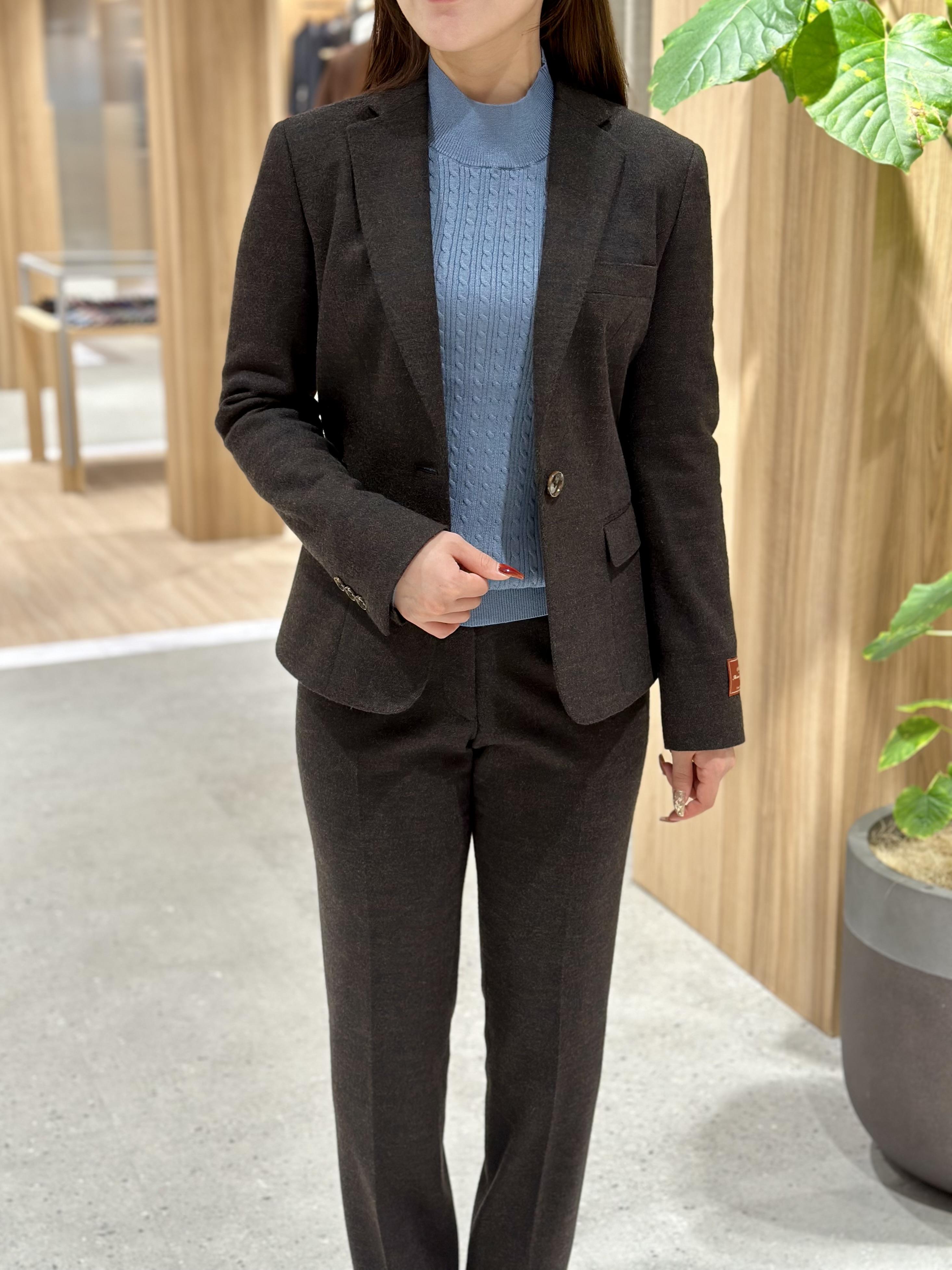 ブラウンのスーツにサックスブルーのニットはアズーロ エ マローネを押さえながらも