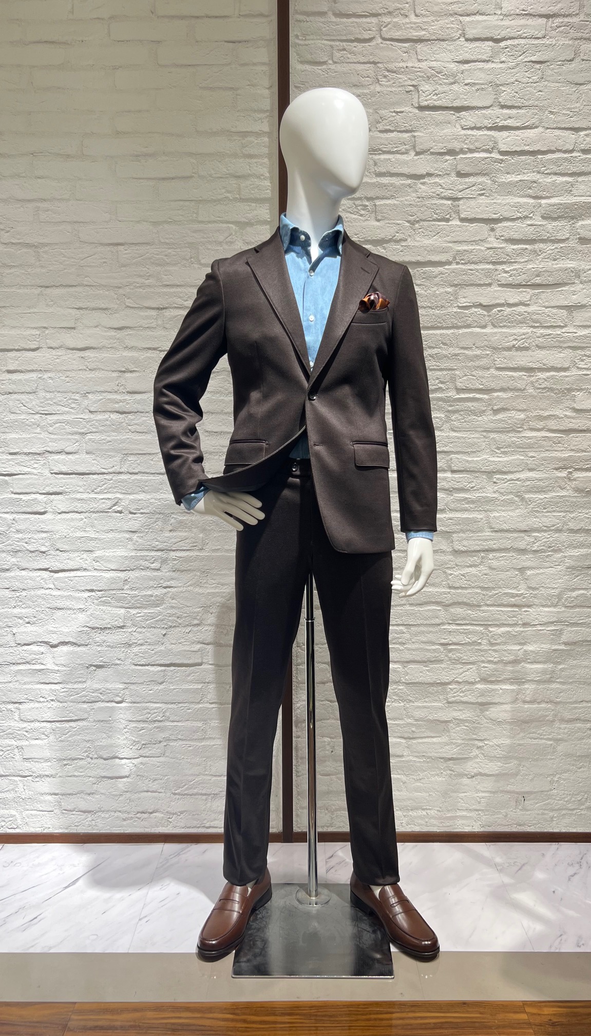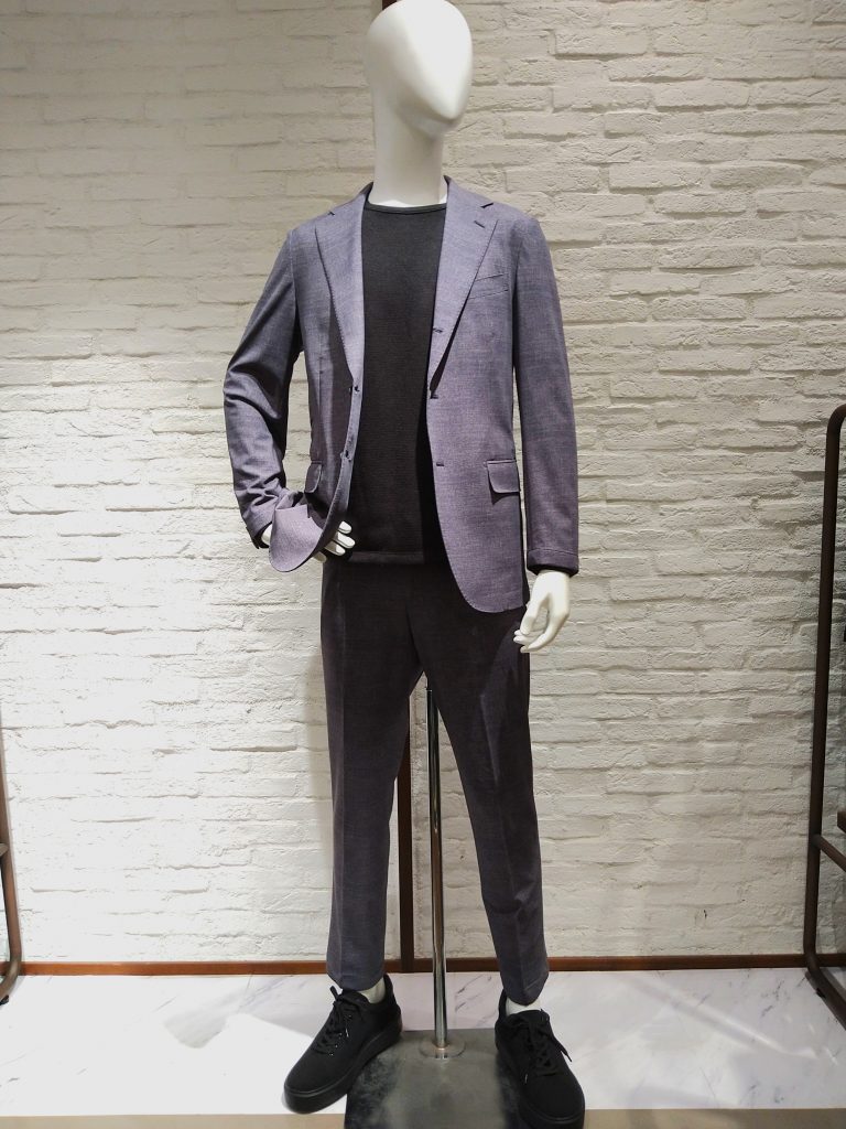 オフィスのビジネススタイルも多様化してきて、Tシャツやニットに合うスーツが欲しい、スニーカーにも合わせられるスーツが欲しい、着心地が楽なスーツが欲しいなど従来とは違う雰囲気の物を探されているお客様も増えてきています。