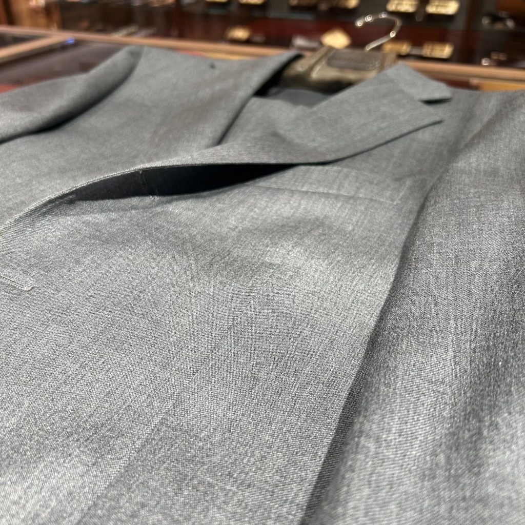 ウールベースに上質なモヘアを30%ブレンドした、CANONICO社製ファブリック使用のグレースーツ。
